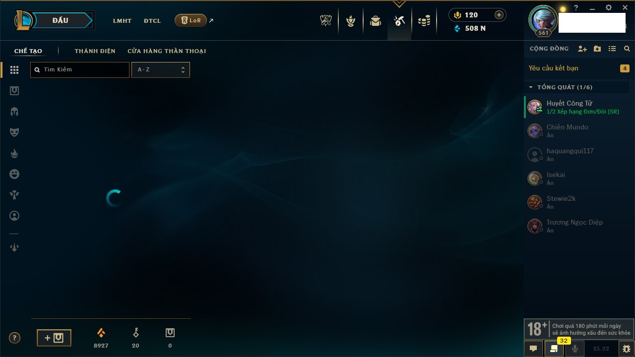 Rank Đơn: Vàng IIIKhung: VàngTướng: 171 - Còn 212486 THXTrang Phục: 201Rank ĐTCL: Bạc ILinh Thú: 79