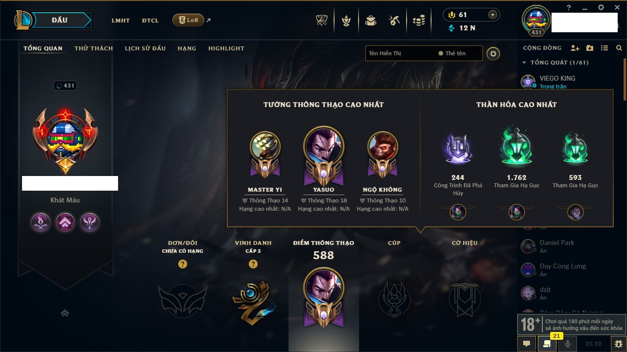 Rank Đơn: Bạch Kim IIIKhung: Bạch kimTướng: 59 - Còn 20316 THXTrang Phục: 29Rank ĐTCL: Chưa RankLinh Thú: 3