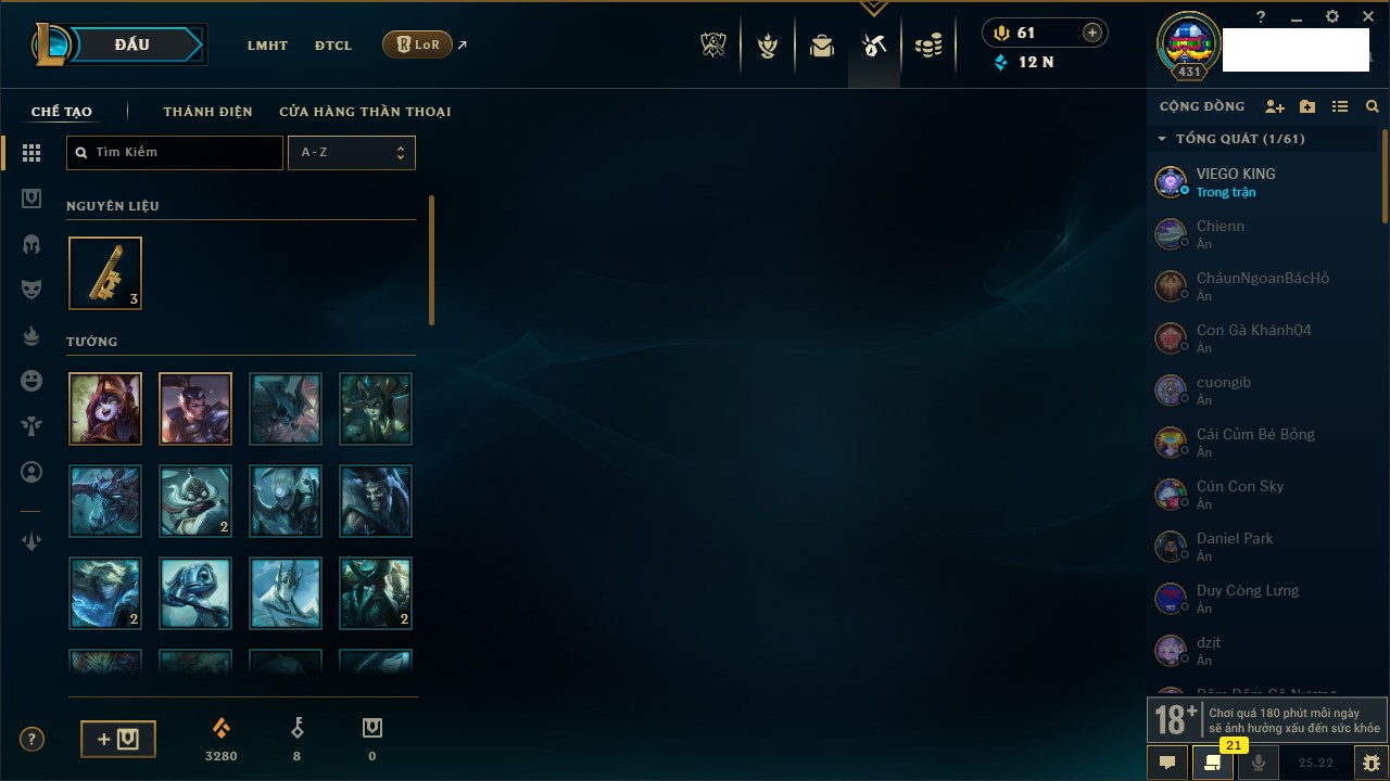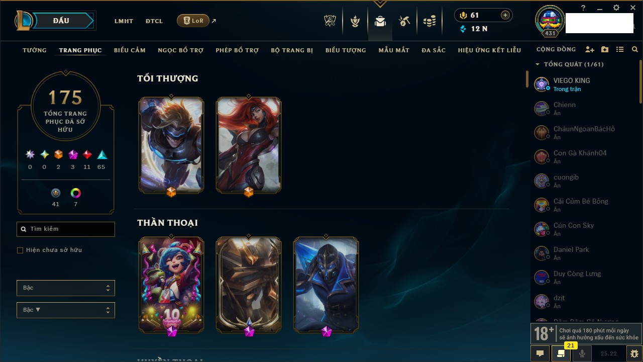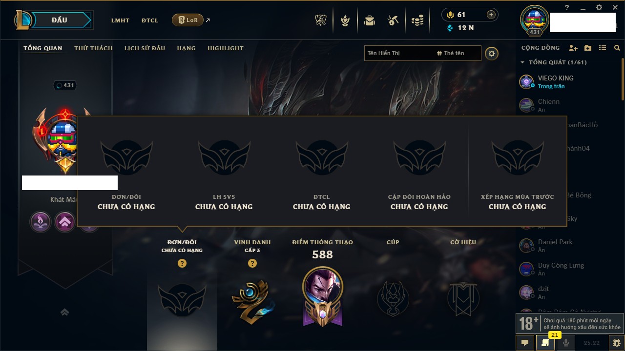 Rank Đơn: Vàng IKhung: Chưa có khungTướng: 168 - Còn 2976 THXTrang Phục: 154Rank ĐTCL: Chưa RankLinh Thú: 81
