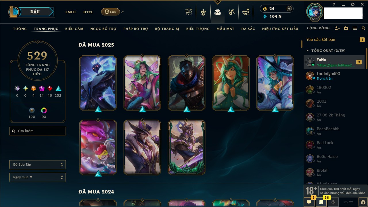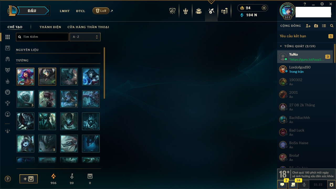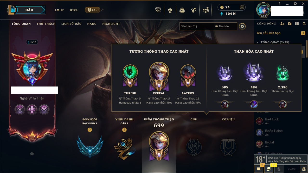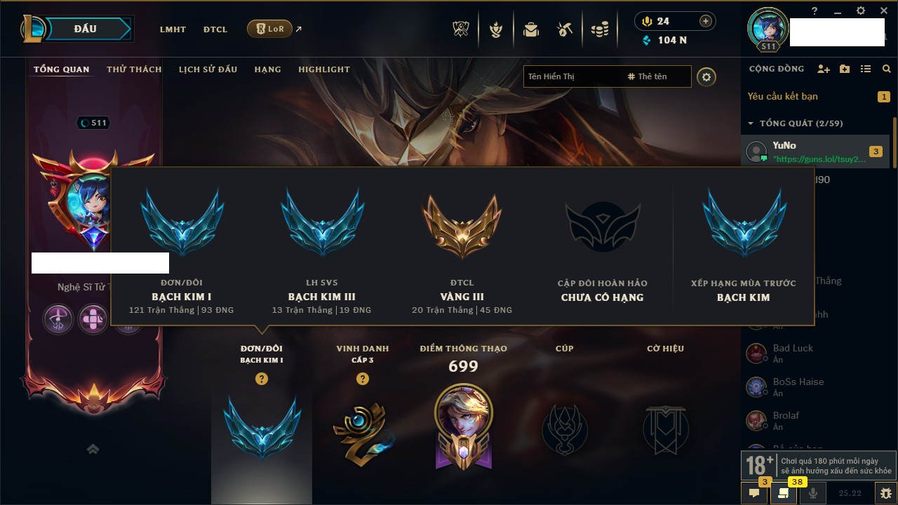 Rank Đơn: Bạch Kim IV Khung: Bạch kim Tướng: 170 - Còn 95523 THX Trang Phục: 243 Rank ĐTCL: Chưa Rank Linh Thú: 150