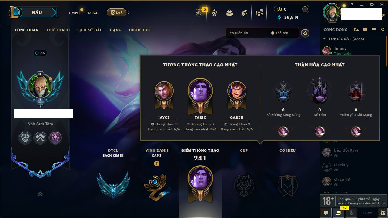 Rank Đơn: Bạch Kim IIKhung: Bạch kimTướng: 171 - Còn 316137 THXTrang Phục: 89Rank ĐTCL: Bạch Kim IIILinh Thú: 94