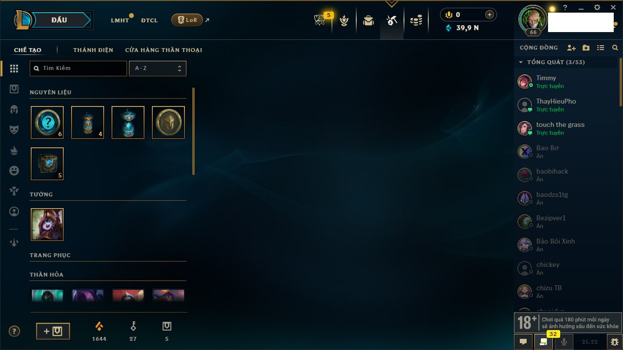 Rank Đơn: Lục Bảo IVKhung: VàngTướng: 171 - Còn 154648 THXTrang Phục: 203Rank ĐTCL: Bạch Kim IVLinh Thú: 69
