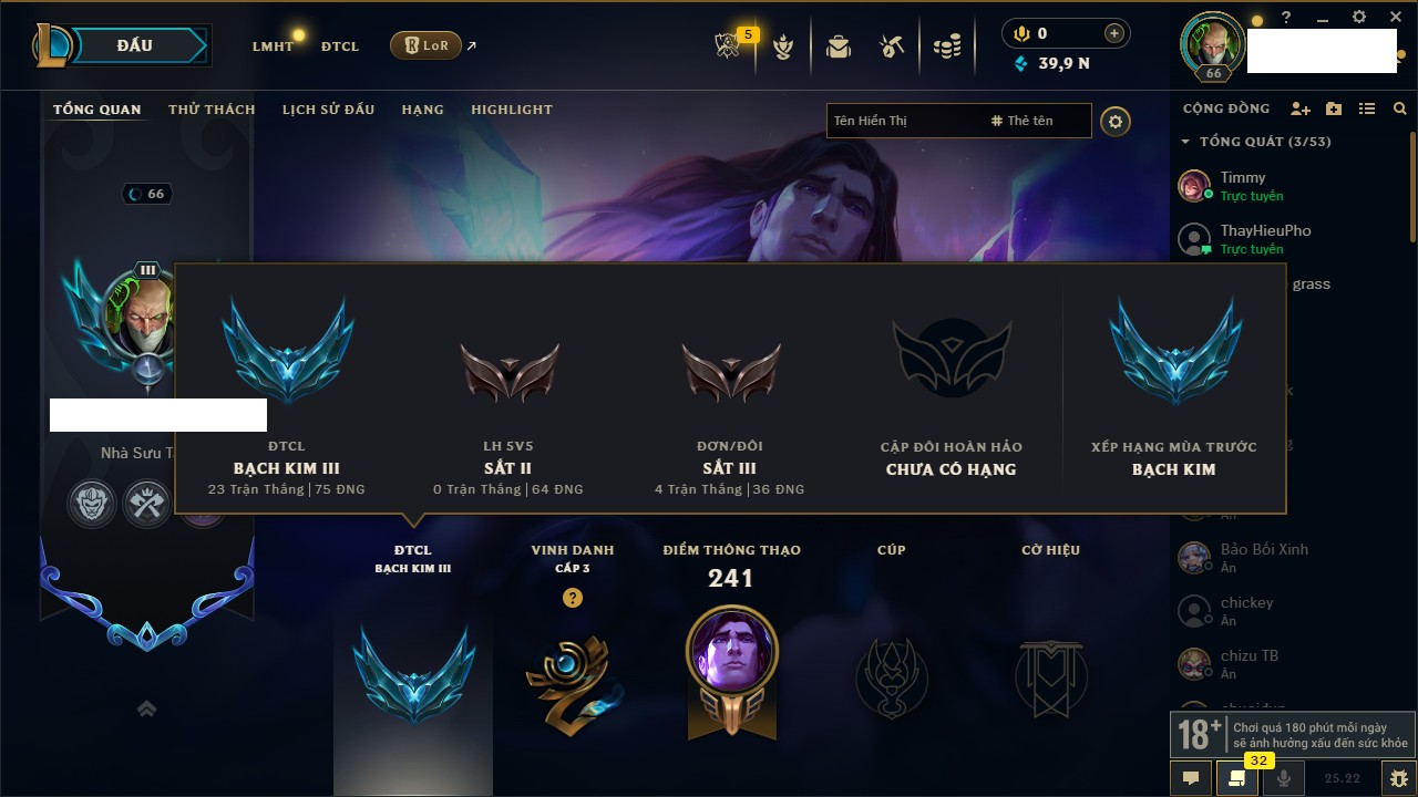Rank Đơn: Bạch Kim IIIKhung: Bạch kimTướng: 171 - Còn 136108 THXTrang Phục: 261Rank ĐTCL: Bạc IVLinh Thú: 73