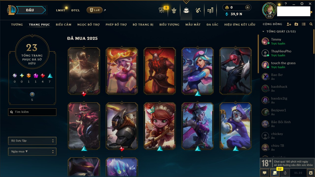 Rank Đơn: Vàng IIIKhung: VàngTướng: 172 - Còn 164704 THXTrang Phục: 255Rank ĐTCL: Kim Cương IVLinh Thú: 156