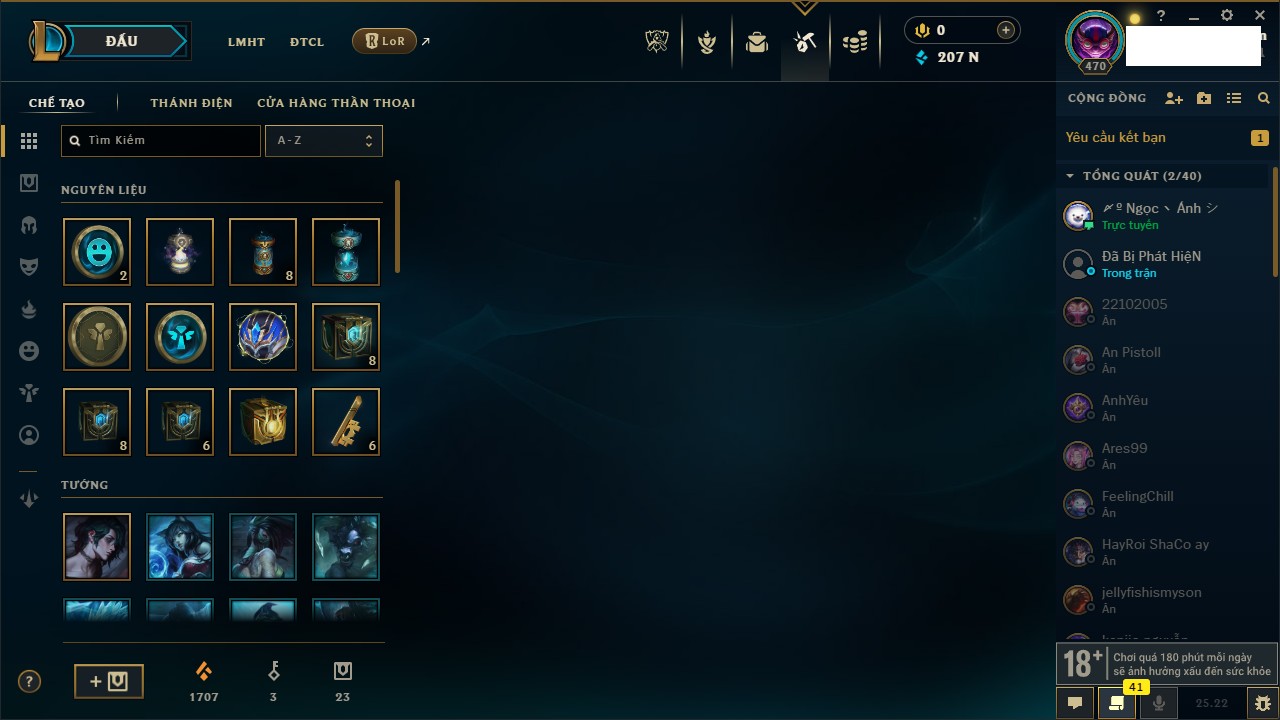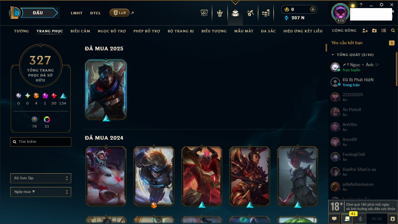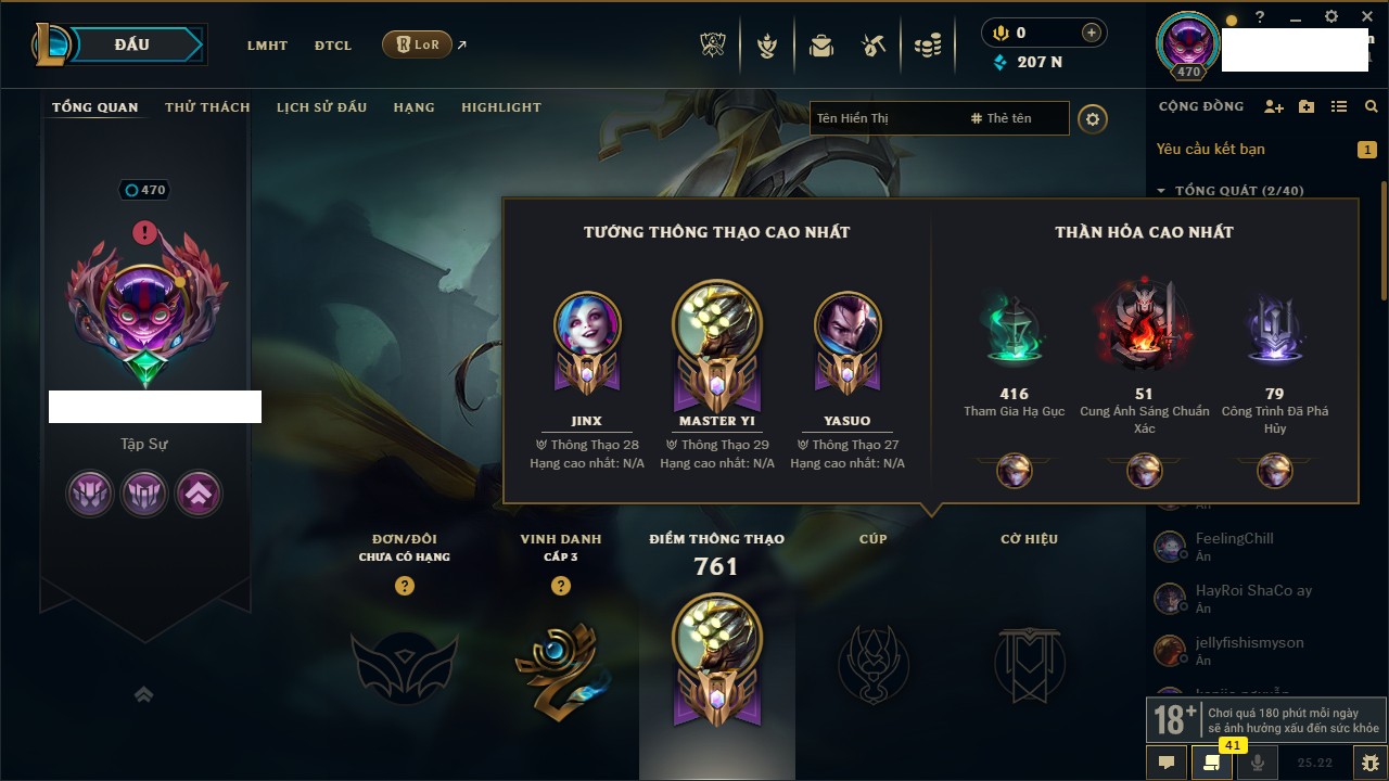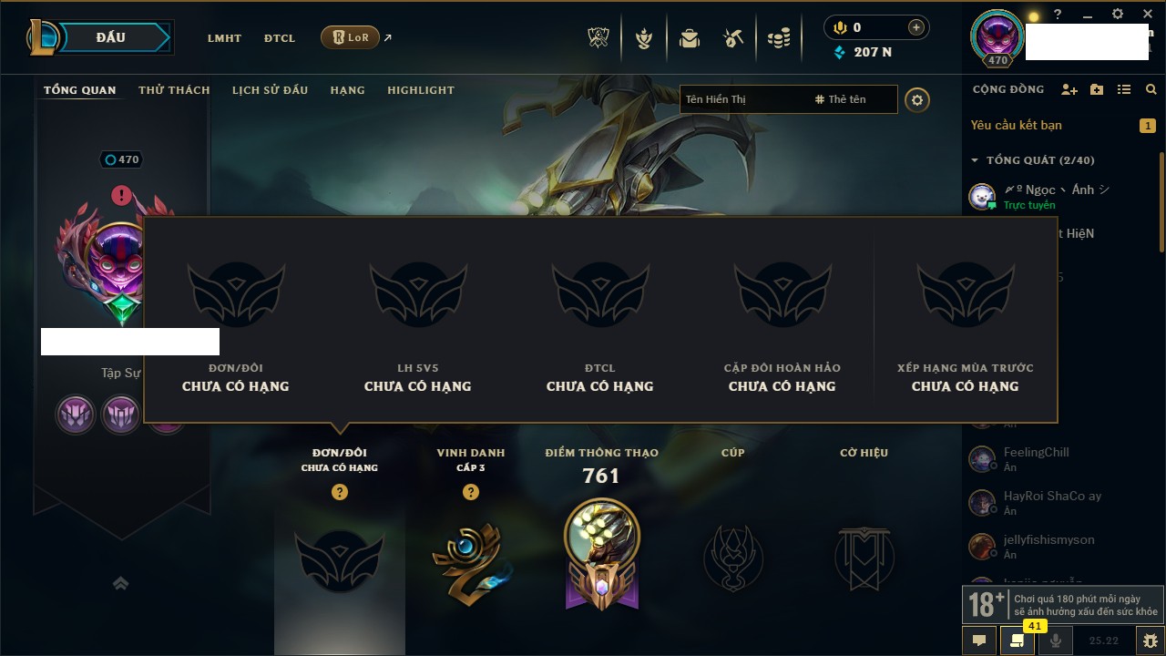 Rank Đơn: Vàng IKhung: BạcTướng: 171 - Còn 60584 THXTrang Phục: 286Rank ĐTCL: Vàng IIILinh Thú: 117