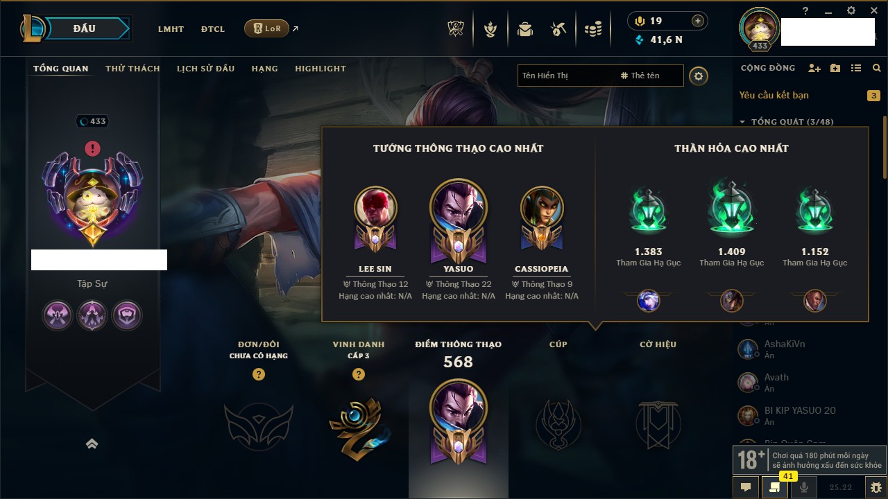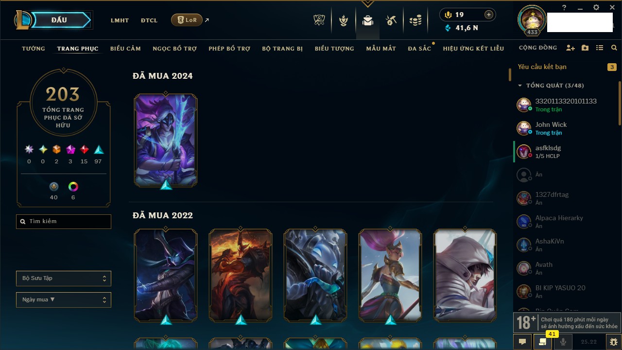 Rank Đơn: Vàng IVKhung: VàngTướng: 171 - Còn 48721 THXTrang Phục: 171Rank ĐTCL: Chưa RankLinh Thú: 27