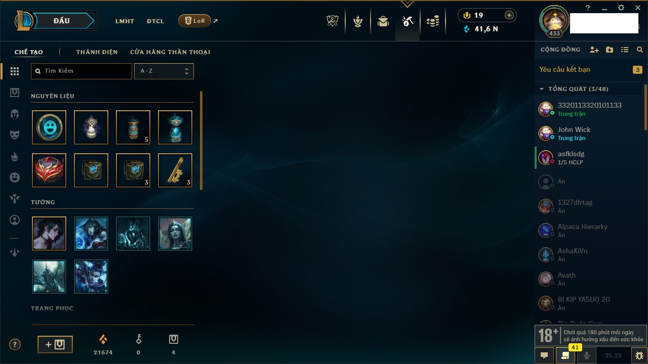 Rank Đơn: Vàng IVKhung: BạcTướng: 166 - Còn 180925 THXTrang Phục: 163Rank ĐTCL: Chưa RankLinh Thú: 67