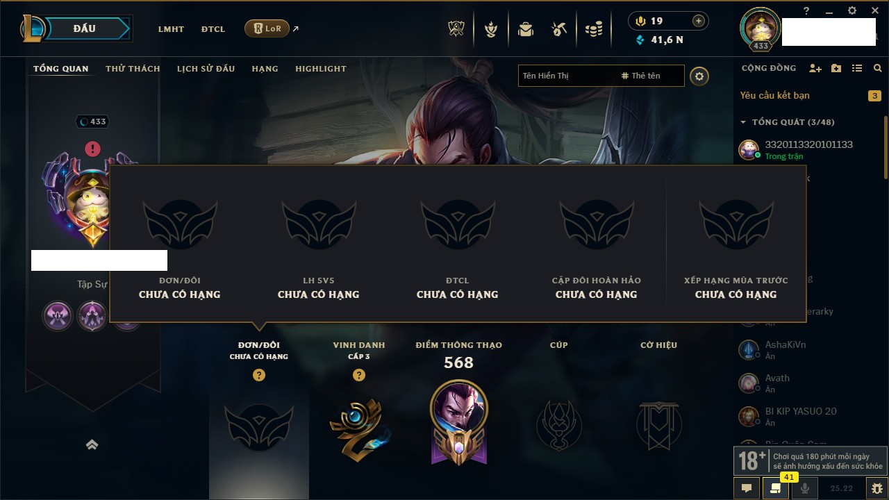 Rank Đơn: Bạc IIKhung: VàngTướng: 171 - Còn 332462 THXTrang Phục: 165Rank ĐTCL: Kim Cương IVLinh Thú: 181