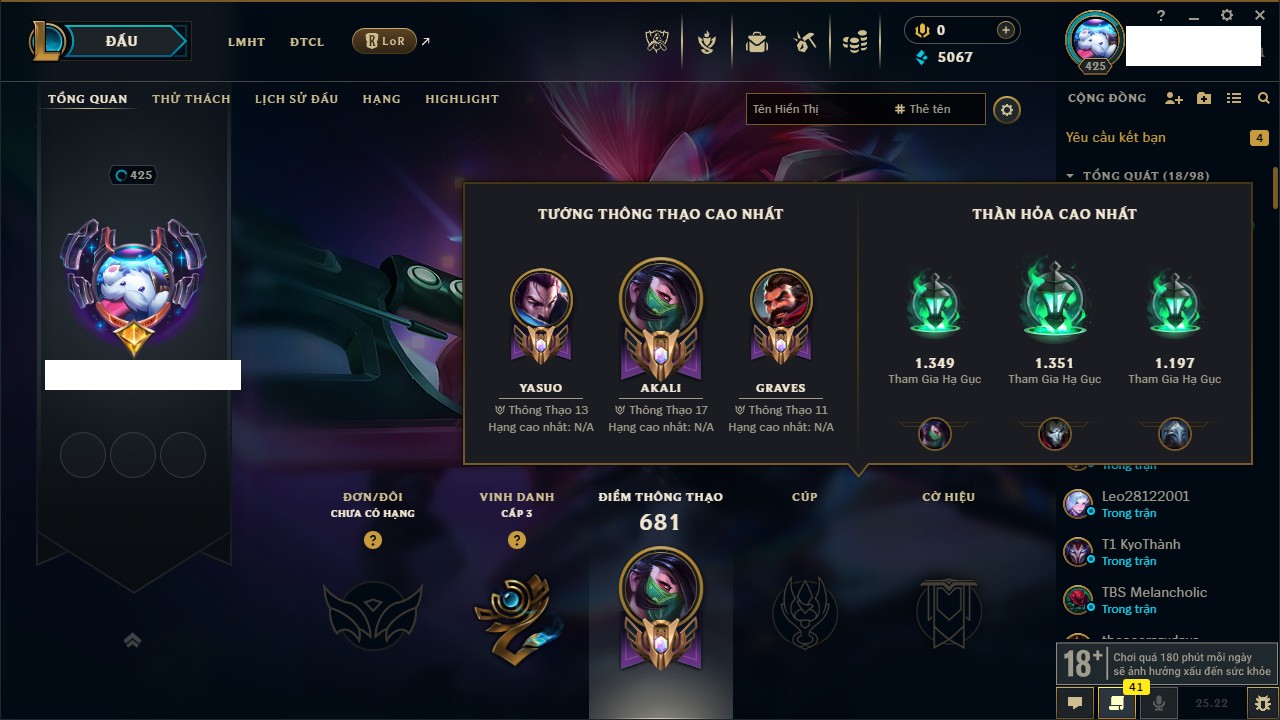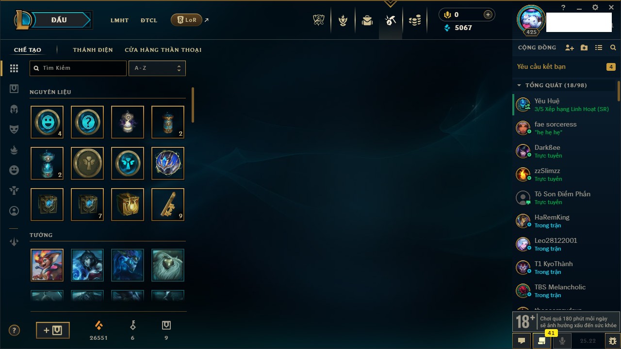 Rank Đơn: Bạch Kim IVKhung: Bạch kimTướng: 171 - Còn 182788 THXTrang Phục: 158Rank ĐTCL: Lục Bảo IVLinh Thú: 56