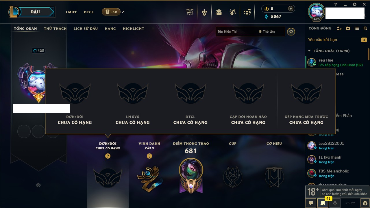 Rank Đơn: Bạch Kim IIKhung: Bạch kimTướng: 171 - Còn 263986 THXTrang Phục: 306Rank ĐTCL: Lục Bảo IVLinh Thú: 96