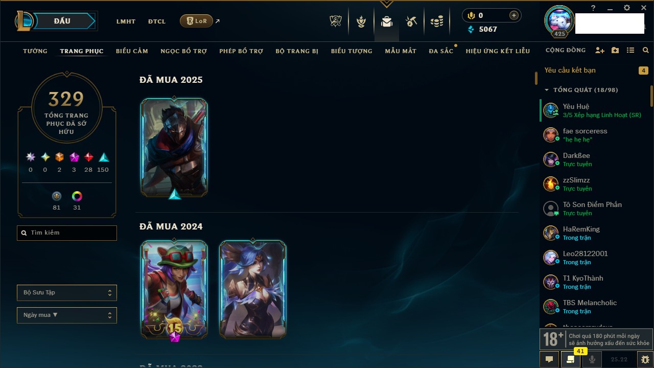 Rank Đơn: Vàng IKhung: Bạch kimTướng: 170 - Còn 212450 THXTrang Phục: 214Rank ĐTCL: Bạch Kim IVLinh Thú: 221