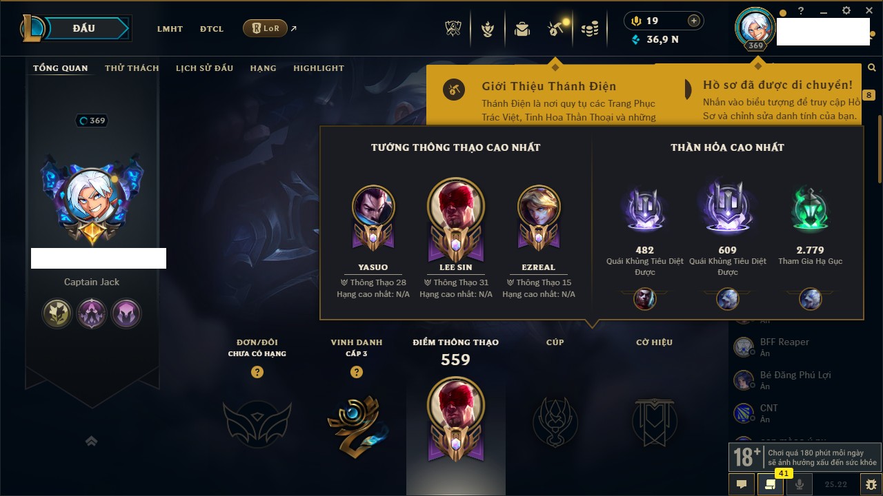 Rank Đơn: Chưa rank mùa nàoKhung: Chưa có khungTướng: 159 - Còn 34939 THXTrang Phục: 59Rank ĐTCL: Chưa RankLinh Thú: 325