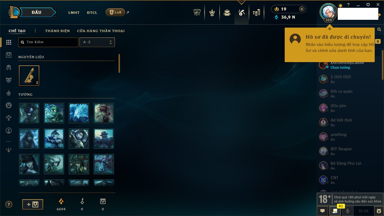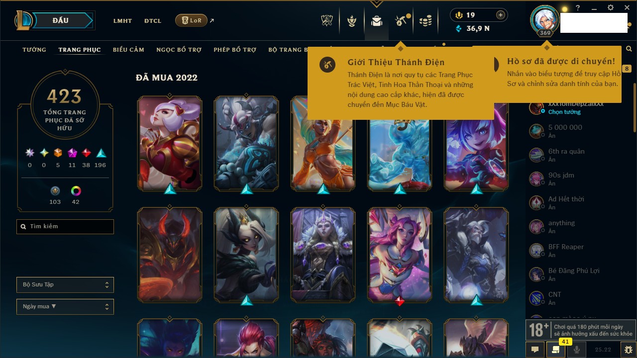 Rank Đơn: Bạc IIKhung: Bạch kimTướng: 169 - Còn 81813 THXTrang Phục: 301Rank ĐTCL: Chưa RankLinh Thú: 140