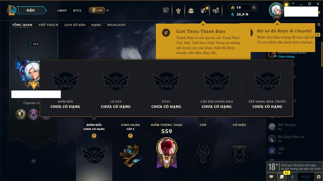 Rank Đơn: Sắt IVKhung: SắtTướng: 171 - Còn 231744 THXTrang Phục: 376Rank ĐTCL: Bạch Kim IILinh Thú: 120