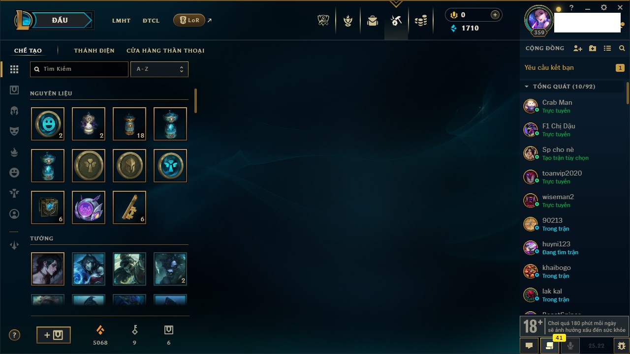Rank Đơn: Chưa RankKhung: Bạch kimTướng: 171 - Còn 182788 THXTrang Phục: 158Rank ĐTCL: Chưa RankLinh Thú: 56