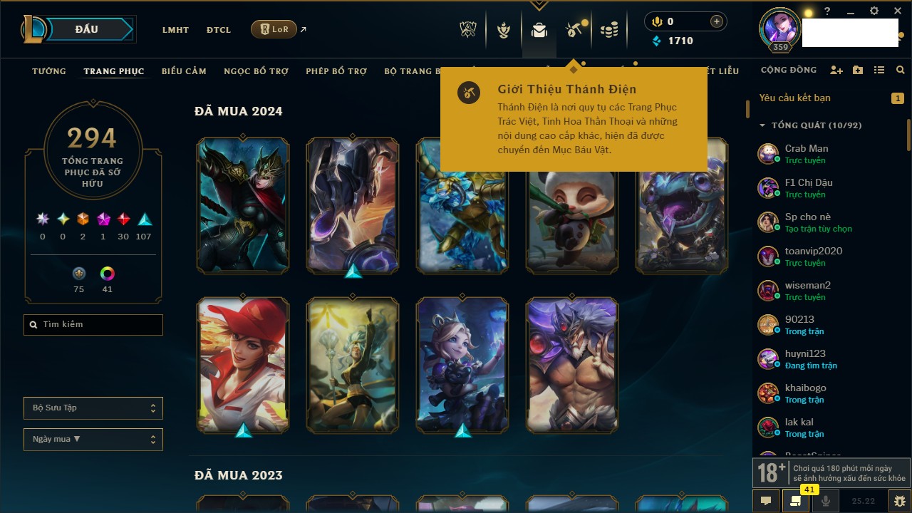 Rank Đơn: Chưa RankKhung: VàngTướng: 170 - Còn 330764 THXTrang Phục: 294Rank ĐTCL: Chưa RankLinh Thú: 58