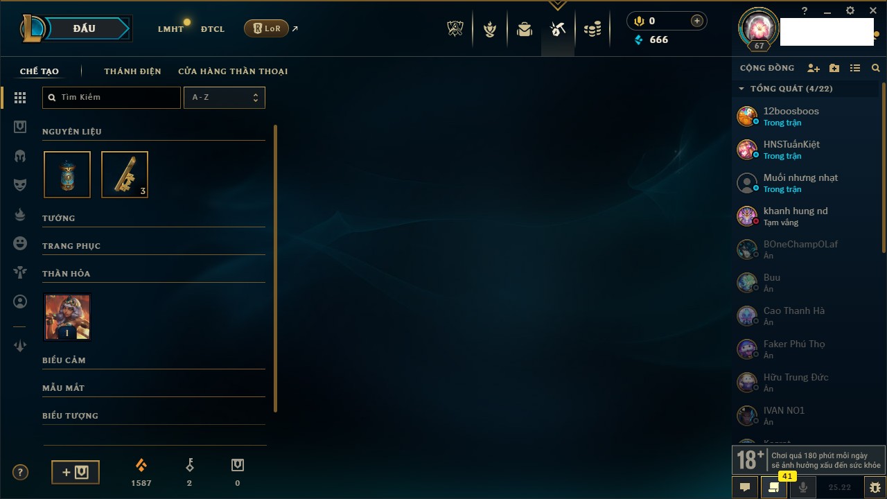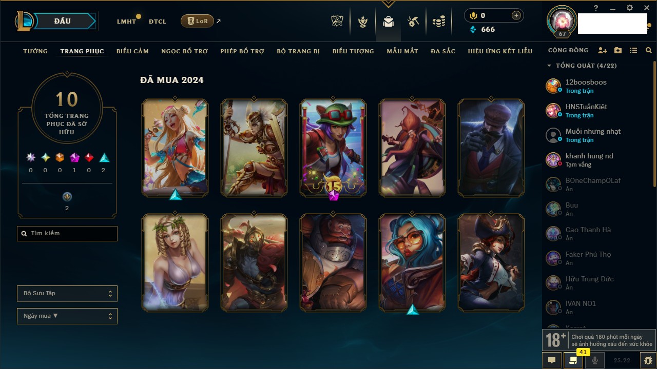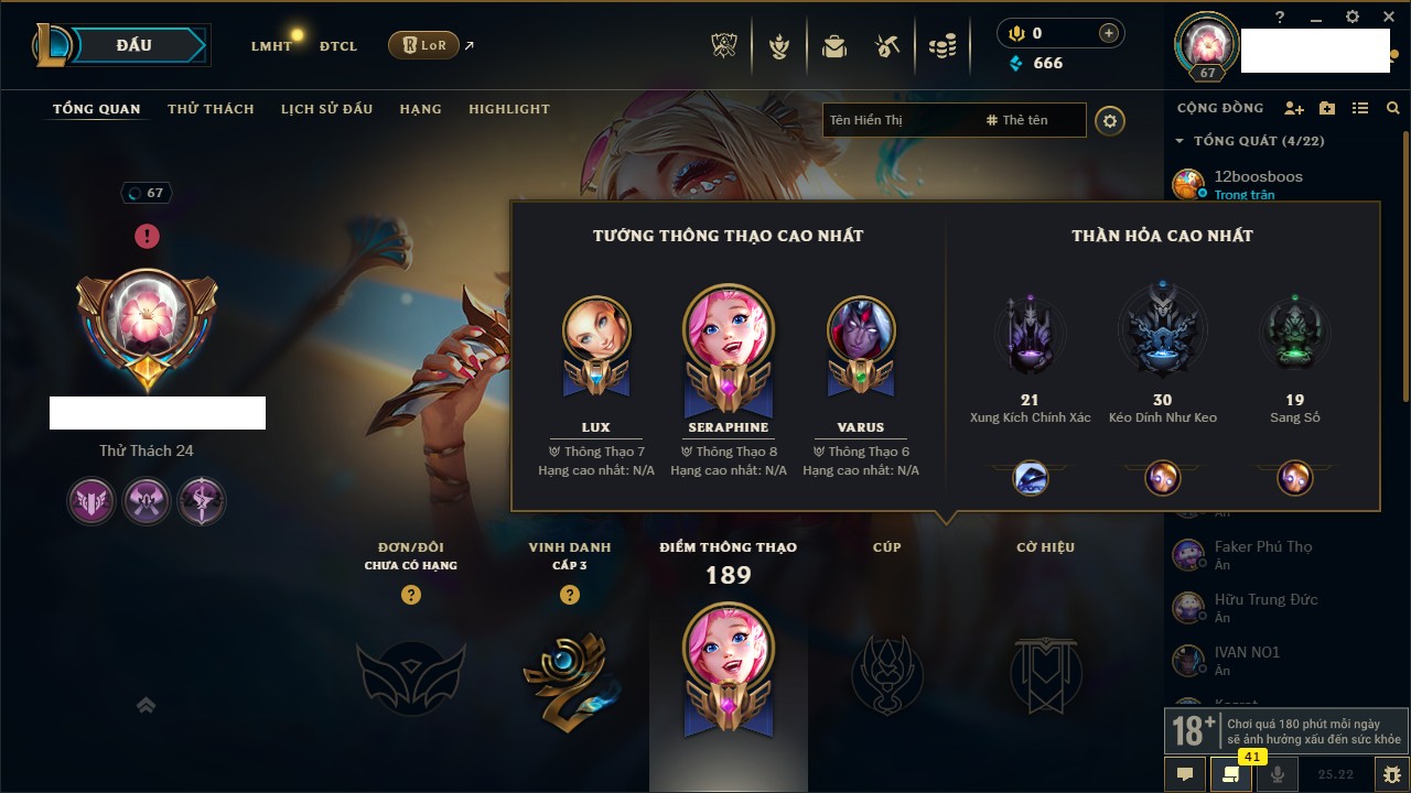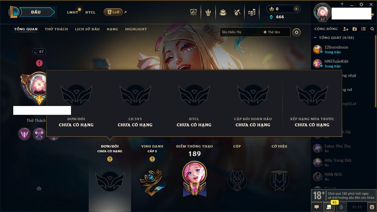Rank Đơn: Vàng IVKhung: BạcTướng: 166 - Còn 180925 THXTrang Phục: 163Rank ĐTCL: Chưa RankLinh Thú: 67