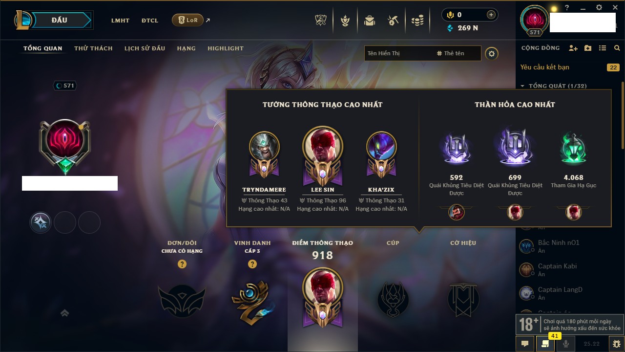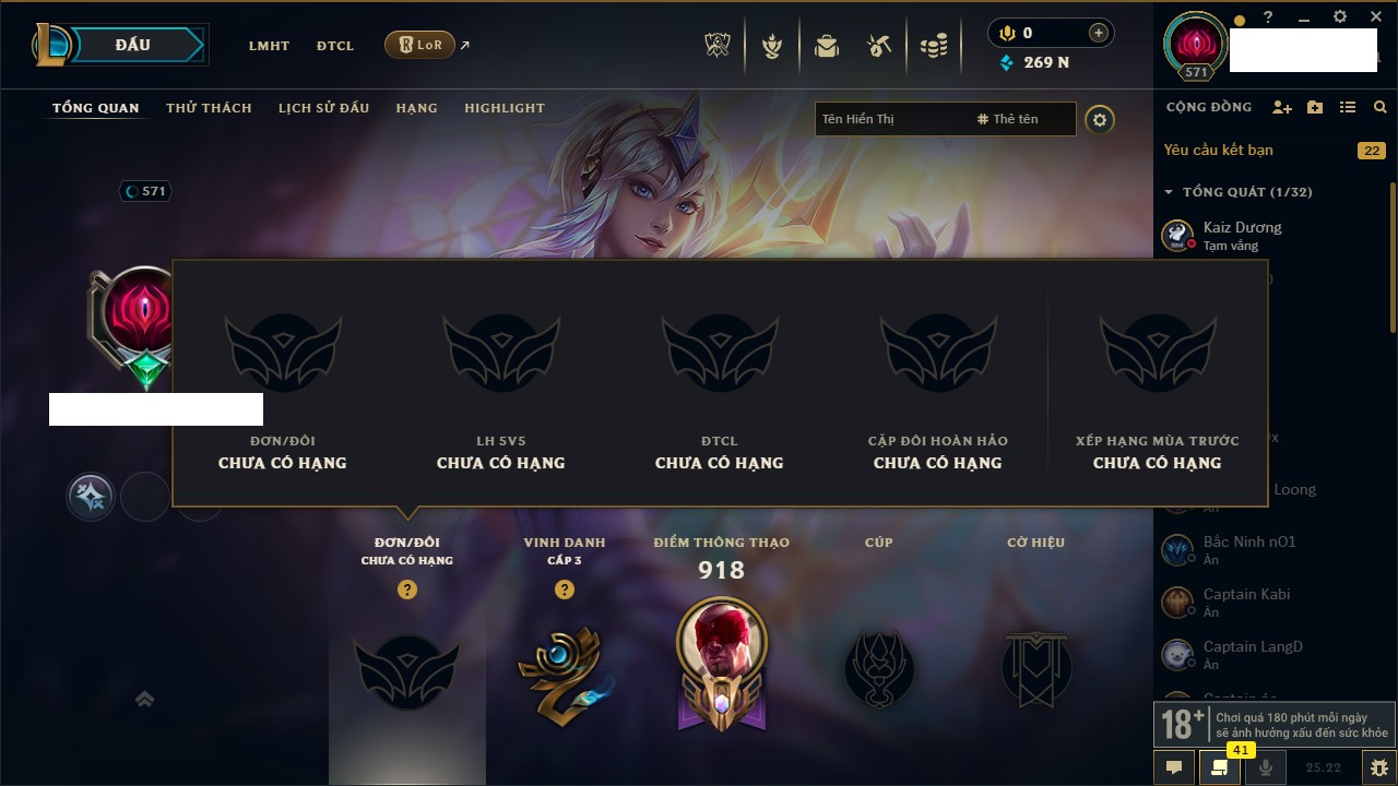 Rank Đơn: Bạch Kim IIKhung: Bạch kimTướng: 171 - Còn 316137 THXTrang Phục: 89Rank ĐTCL: Bạch Kim IIILinh Thú: 94