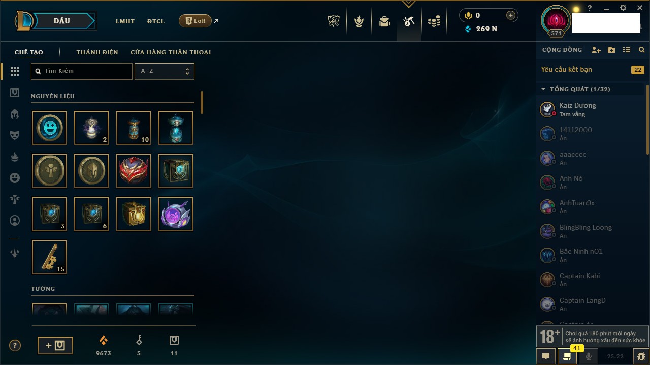 Rank Đơn: Lục Bảo IVKhung: VàngTướng: 171 - Còn 154648 THXTrang Phục: 203Rank ĐTCL: Bạch Kim IVLinh Thú: 69