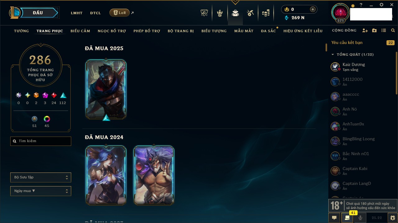Rank Đơn: Vàng IIKhung: VàngTướng: 170 - Còn 243330 THXTrang Phục: 230Rank ĐTCL: Chưa RankLinh Thú: 68
