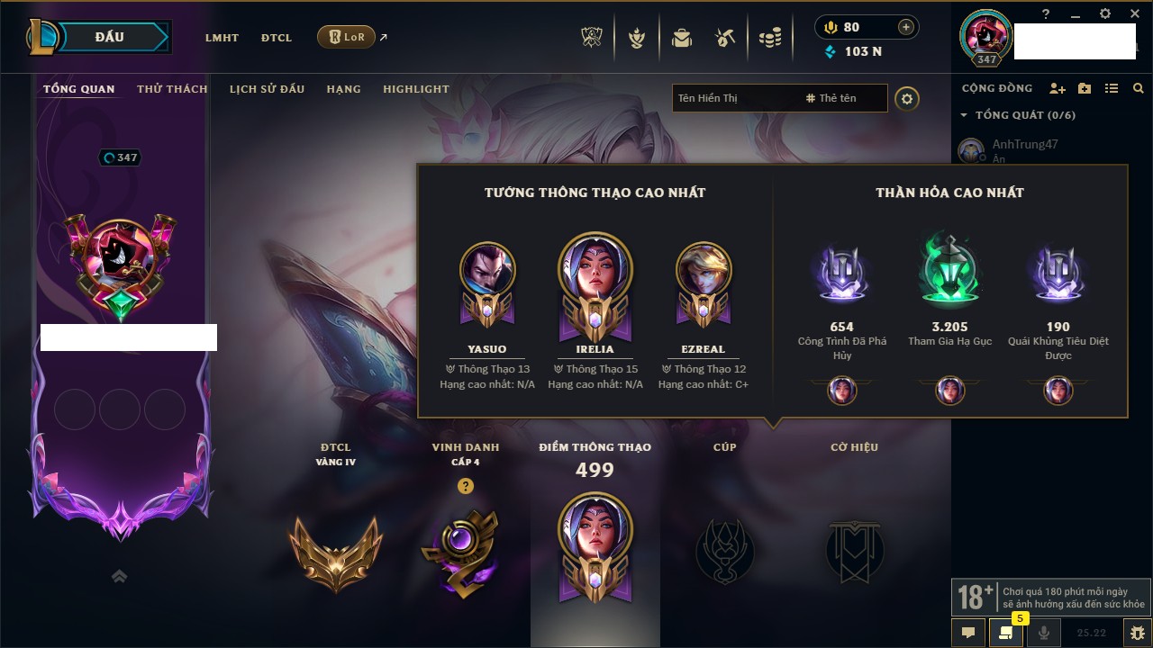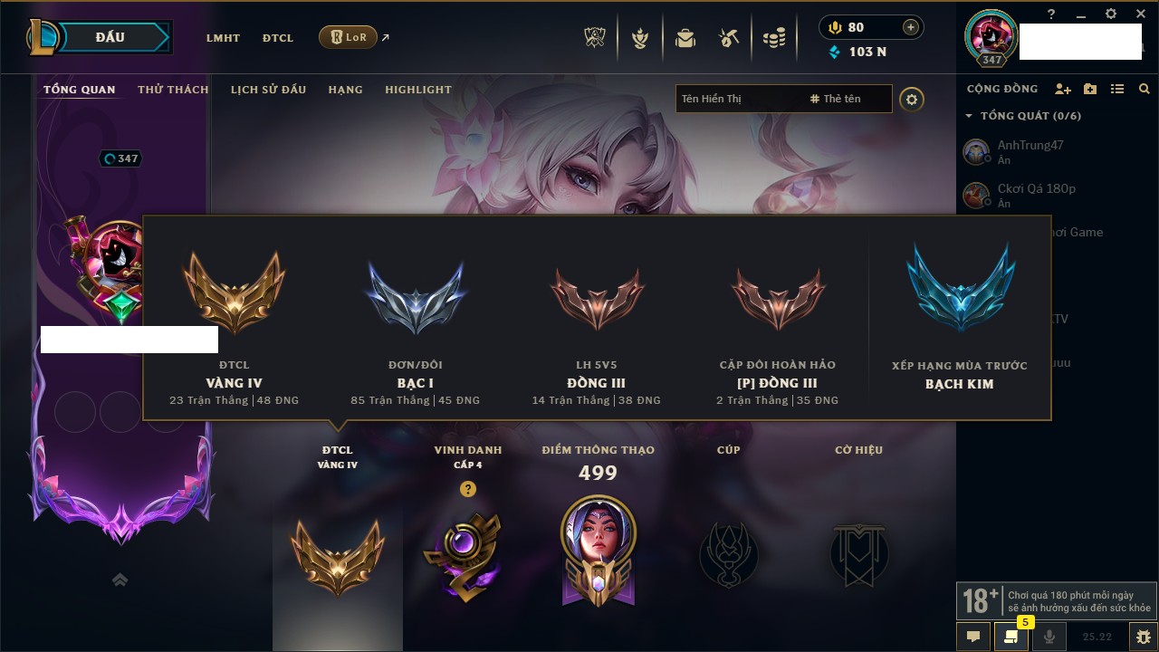 Rank Đơn: Chưa rank mùa nàoKhung: Chưa có khungTướng: 1 - Còn 3000 THXTrang Phục: 0Rank ĐTCL: Vàng ILinh Thú: 6