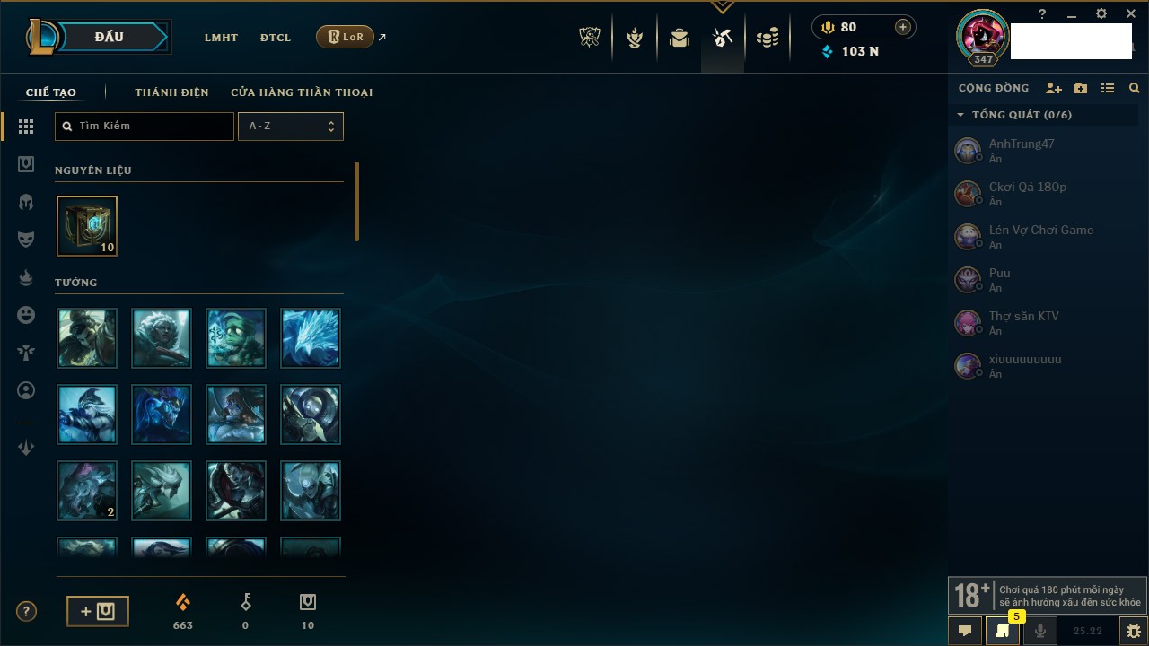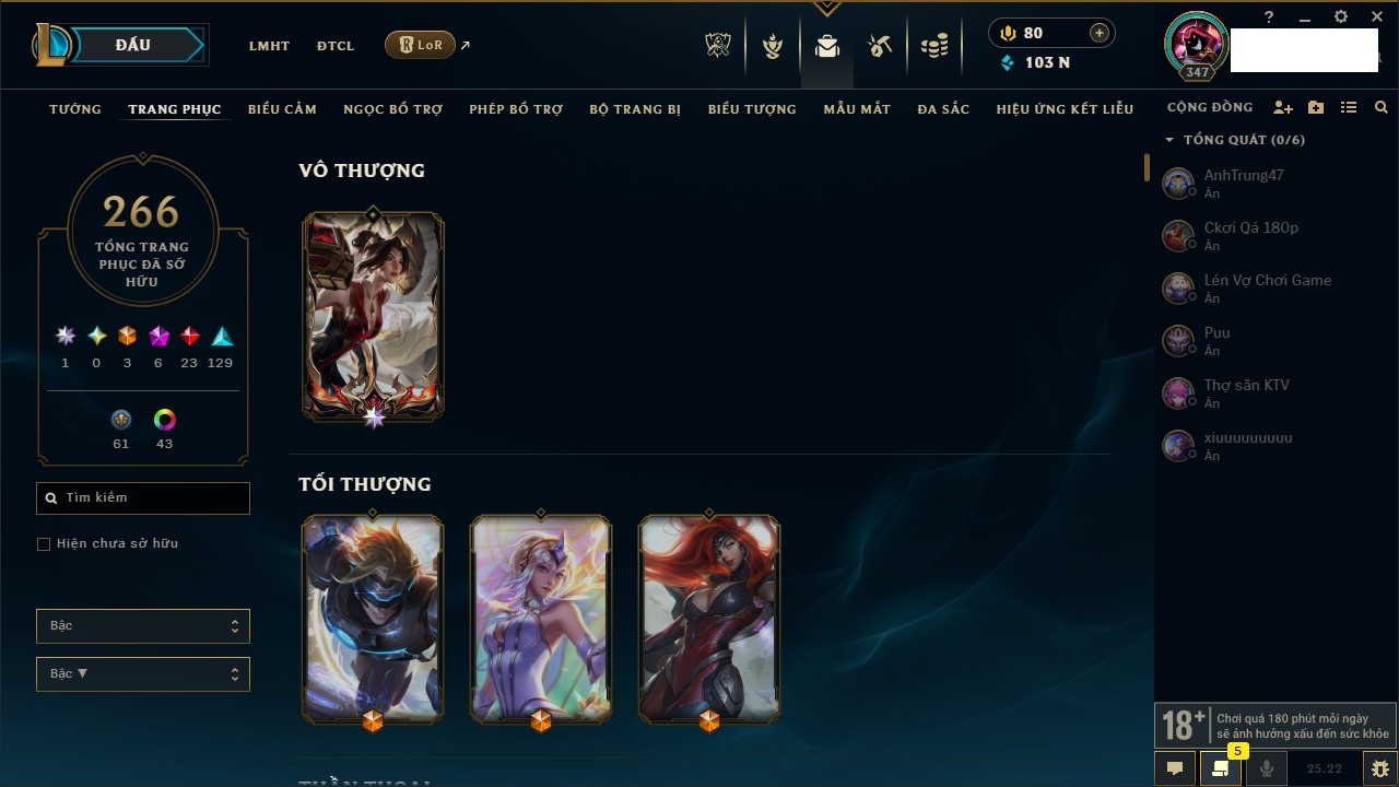 Rank Đơn: Chưa RankKhung: Chưa có khungTướng: 170 - Còn 72514 THXTrang Phục: 202Rank ĐTCL: Chưa RankLinh Thú: 191