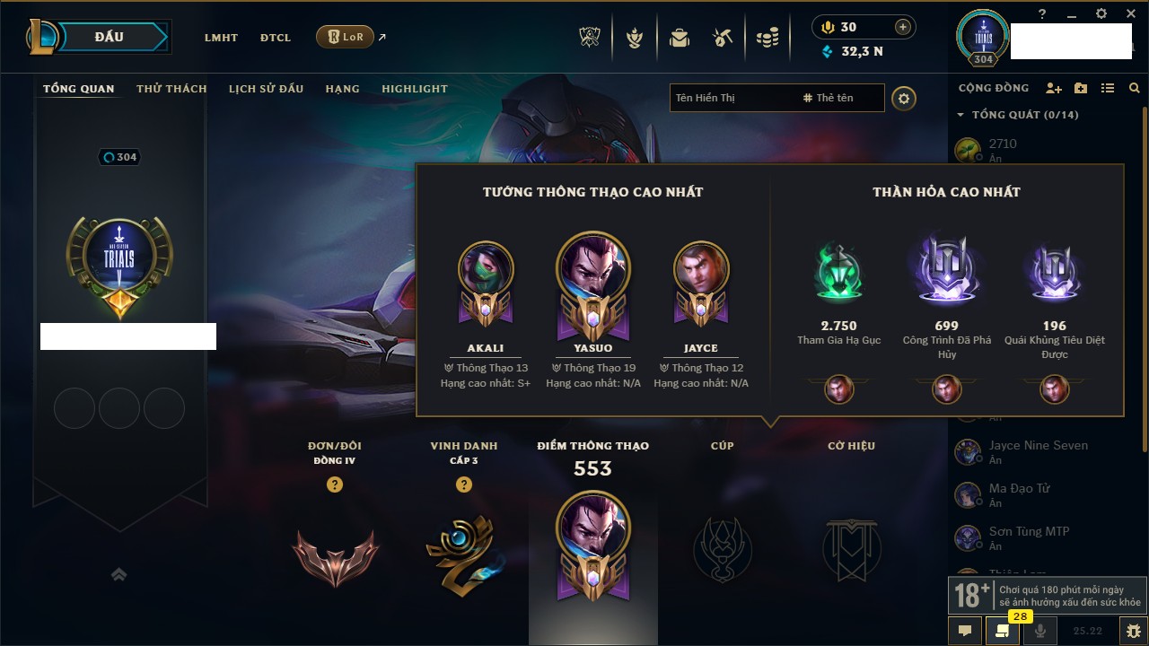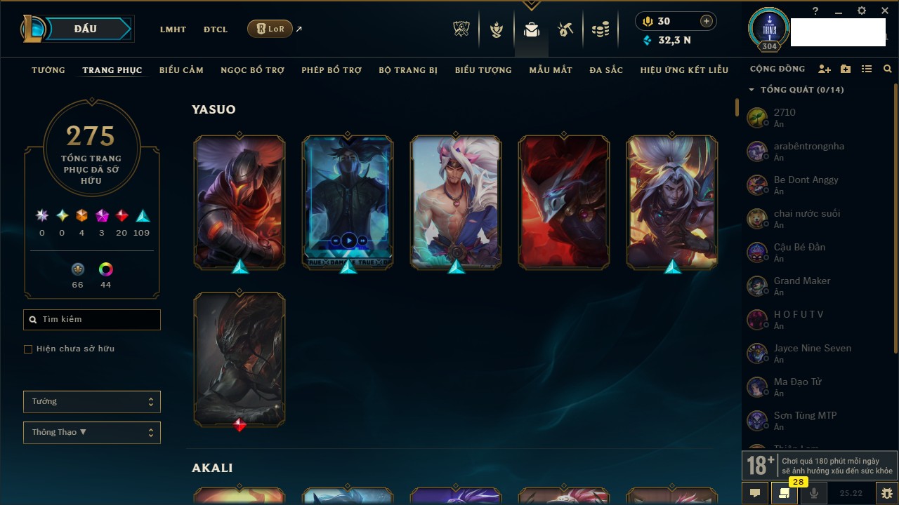 Rank Đơn: Đồng IVKhung: Chưa có khungTướng: 162 - Còn 32315 THXTrang Phục: 275Rank ĐTCL: Chưa RankLinh Thú: 33