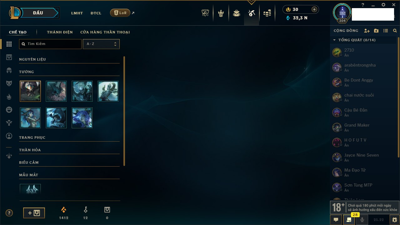 Rank Đơn: Vàng IVKhung: VàngTướng: 171 - Còn 135001 THXTrang Phục: 195Rank ĐTCL: Bạch Kim IVLinh Thú: 147