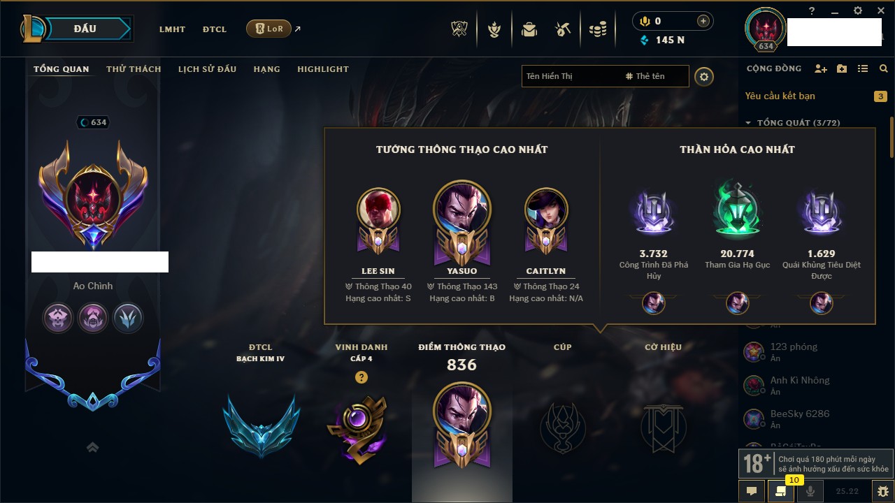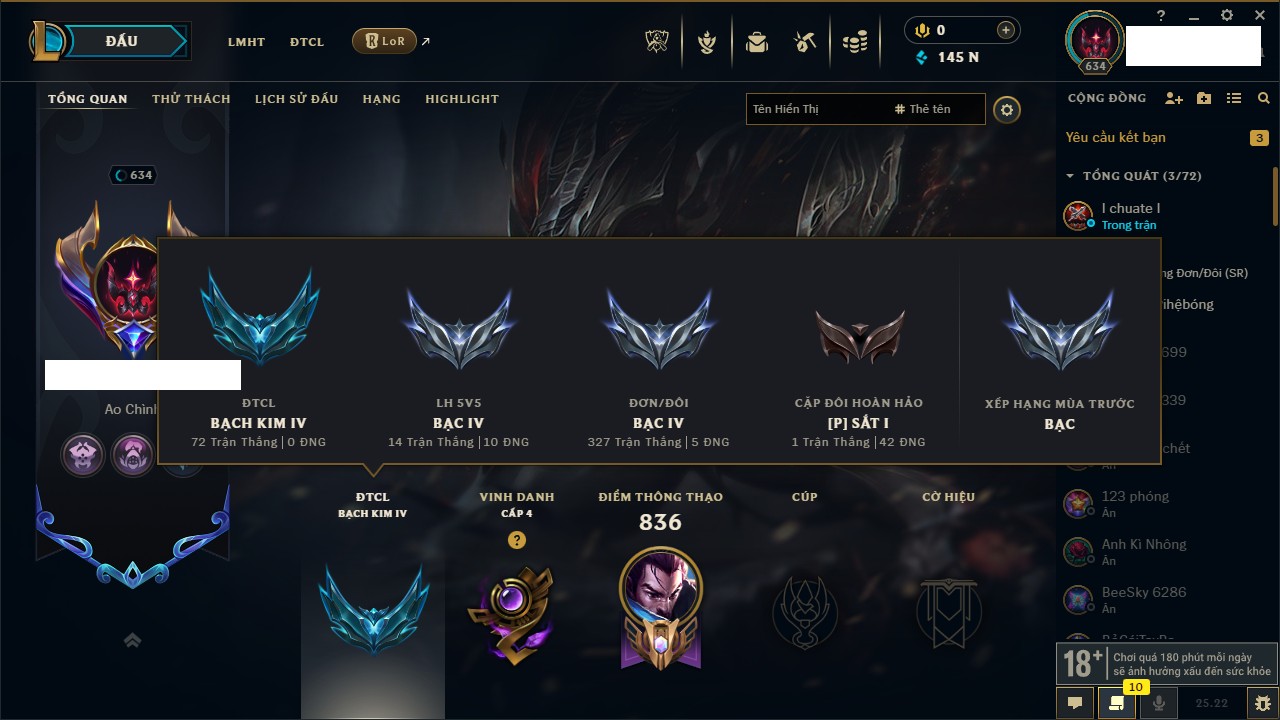 Rank Đơn: Vàng IKhung: BạcTướng: 171 - Còn 60584 THXTrang Phục: 286Rank ĐTCL: Vàng IIILinh Thú: 117
