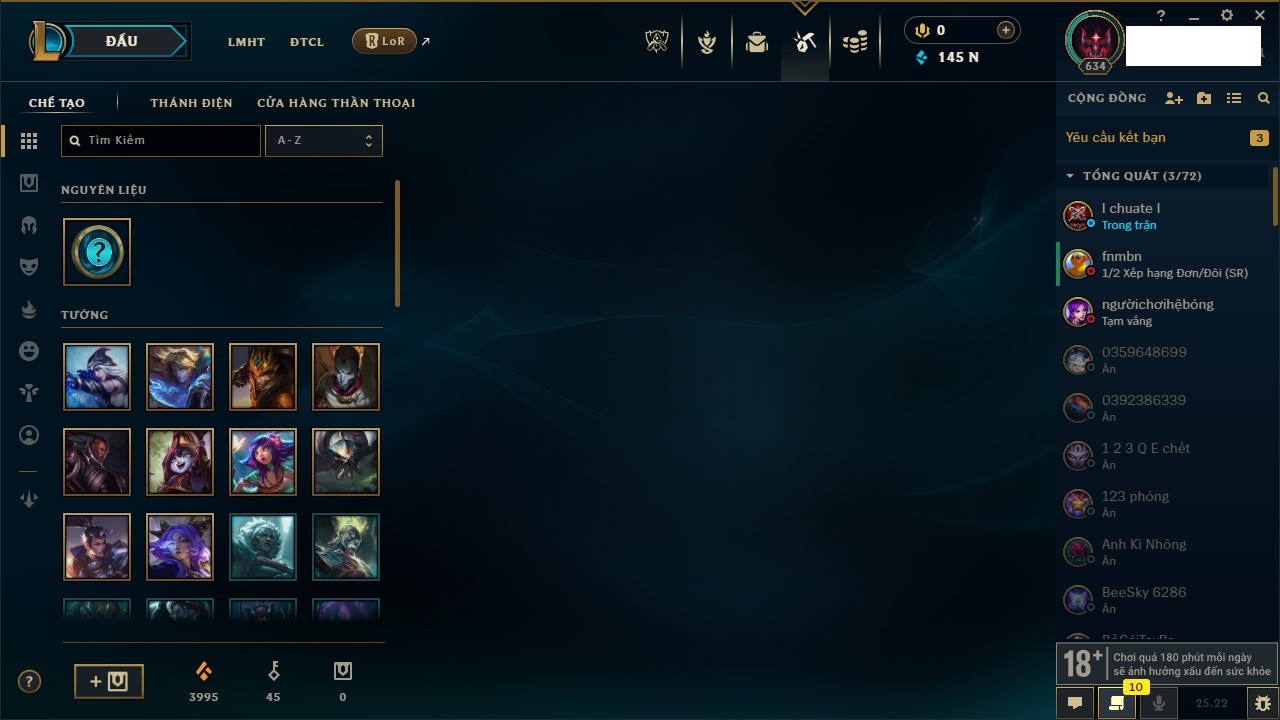 Rank Đơn: Bạch Kim IIIKhung: Bạch kimTướng: 171 - Còn 251383 THXTrang Phục: 229Rank ĐTCL: Sắt IILinh Thú: 51