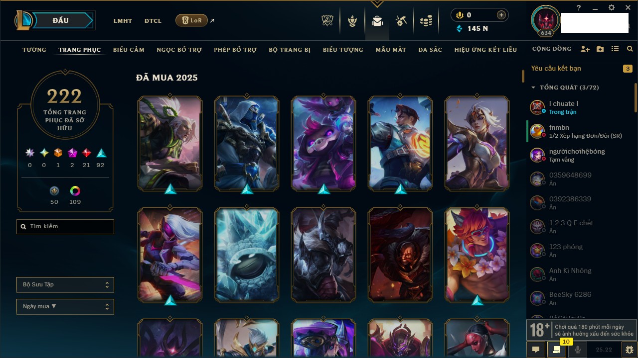 Rank Đơn: Vàng IIIKhung: VàngTướng: 171 - Còn 88128 THXTrang Phục: 329Rank ĐTCL: Chưa RankLinh Thú: 41