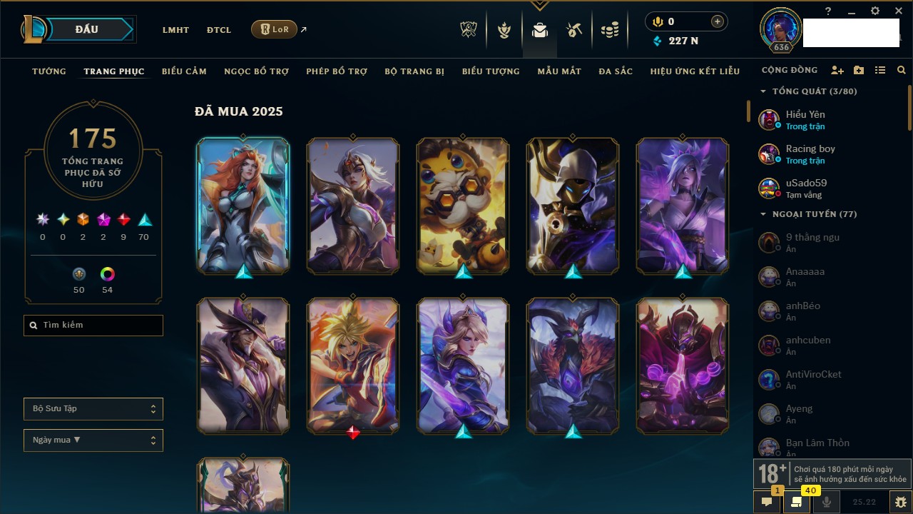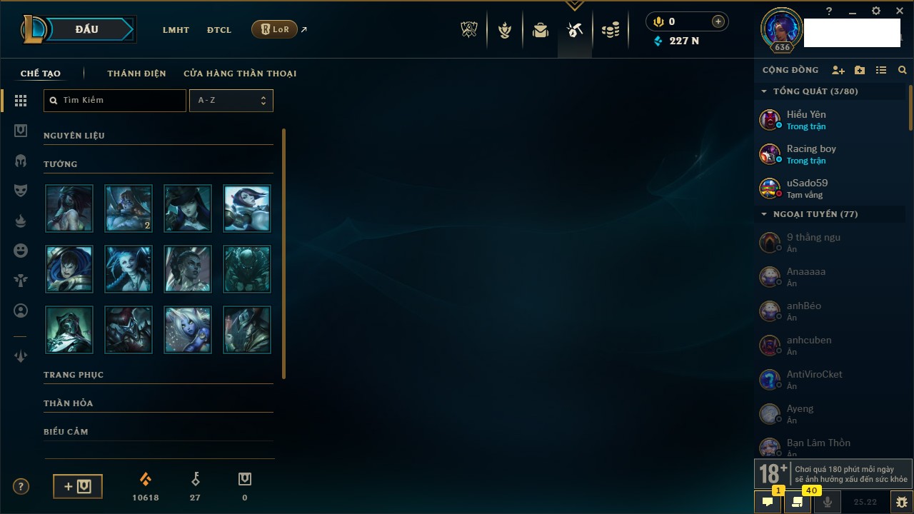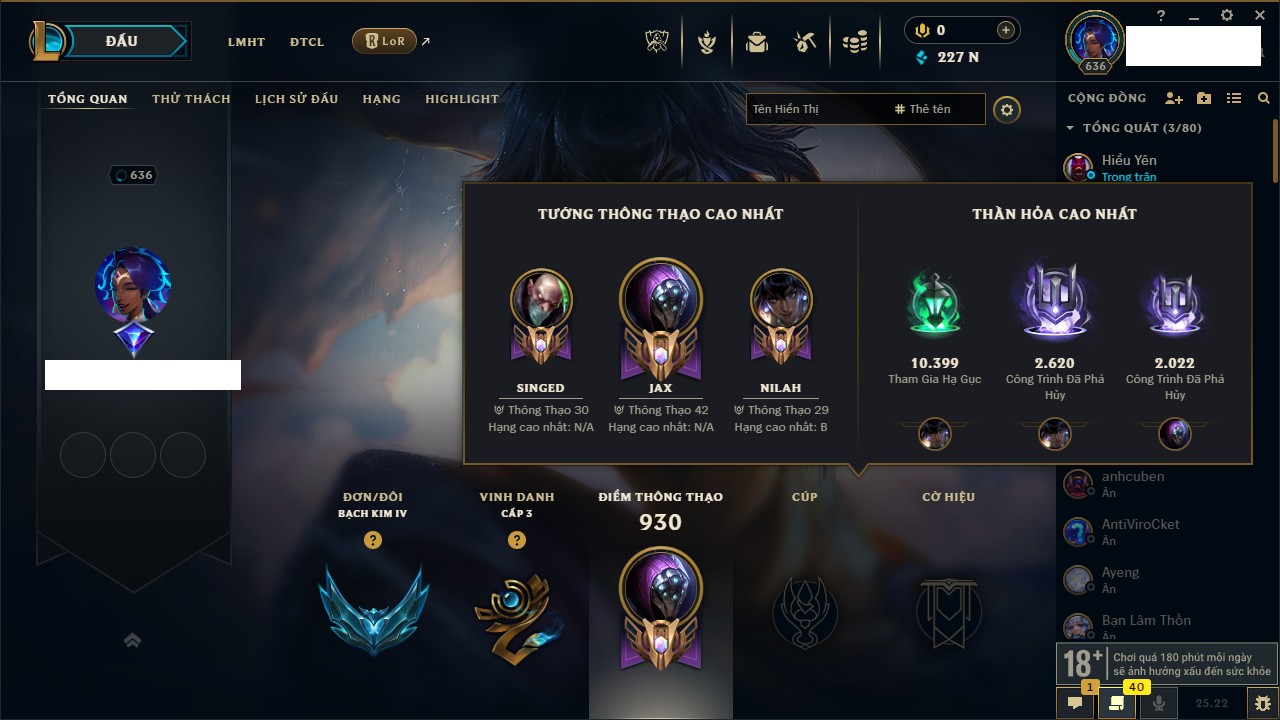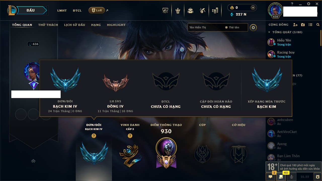 Rank Đơn: Vàng IIKhung: Bạch kimTướng: 172 - Còn 123420 THXTrang Phục: 231Rank ĐTCL: Bạch Kim IVLinh Thú: 213