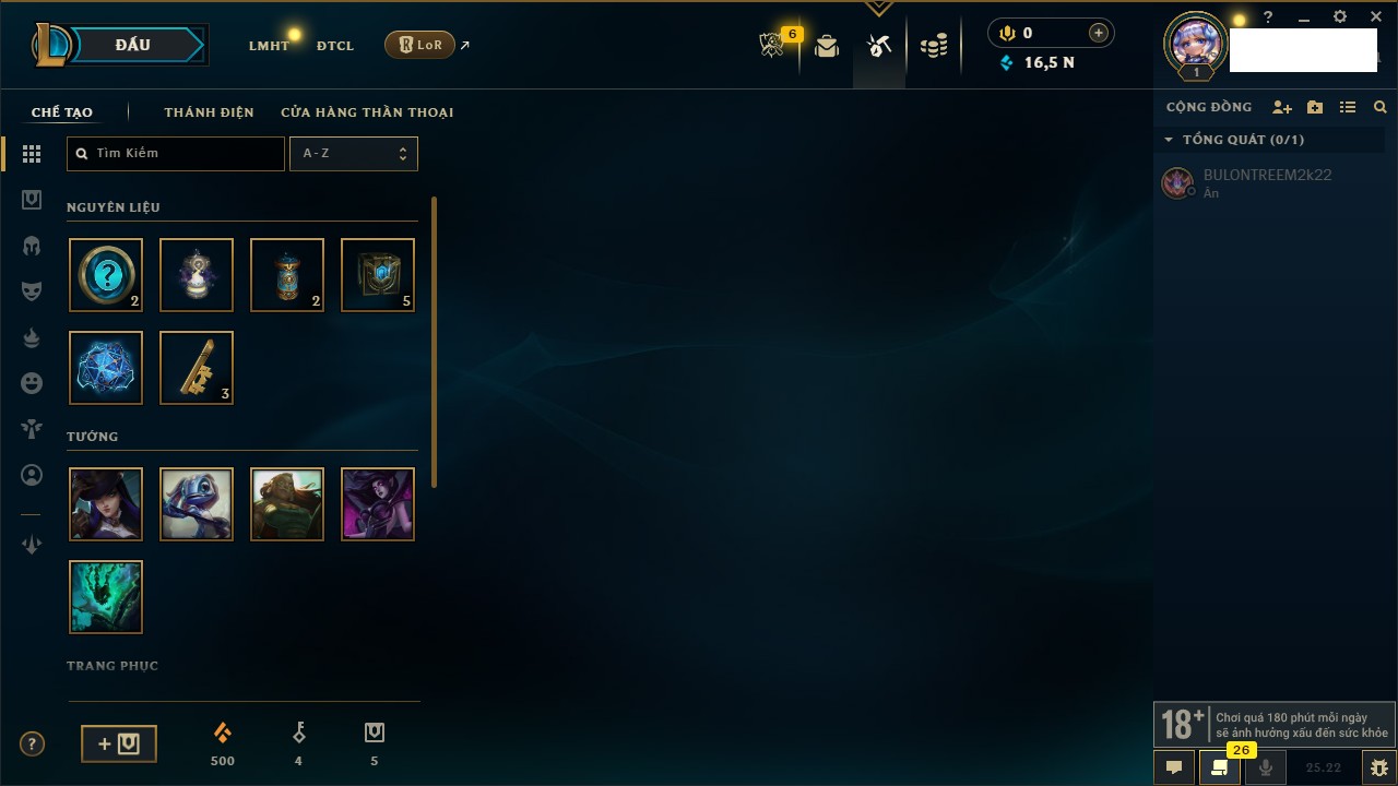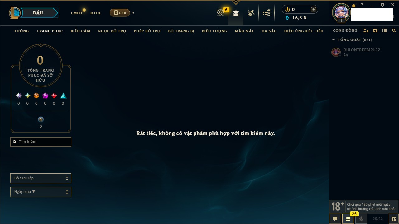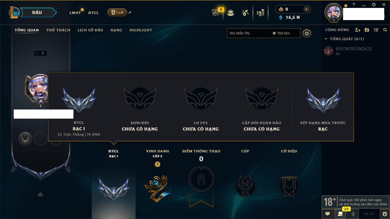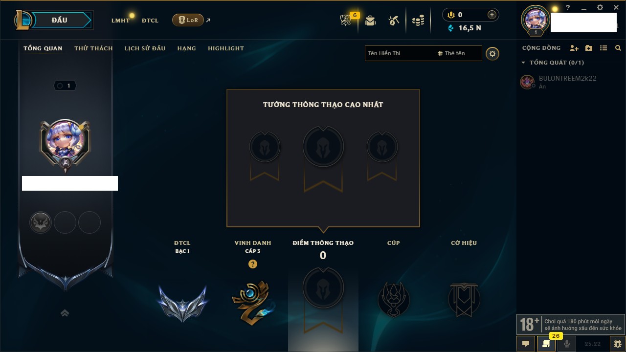 Rank Đơn: Bạc IIIKhung: Chưa có khungTướng: 171 - Còn 21493 THXTrang Phục: 252Rank ĐTCL: Bạch Kim IVLinh Thú: 123