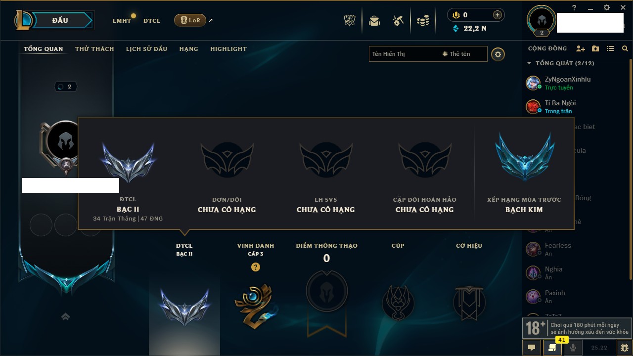 Rank Đơn: Chưa rank mùa nào Khung: Chưa có khung Tướng: 3 - Còn 22250 THX Trang Phục: 0 Rank ĐTCL: Bạc II Linh Thú: 262