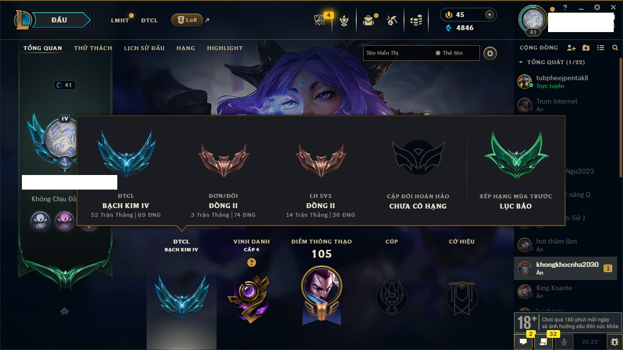 Rank Đơn: Bạc IIIKhung: BạcTướng: 140 - Còn 1624 THXTrang Phục: 36Rank ĐTCL: Chưa RankLinh Thú: 118