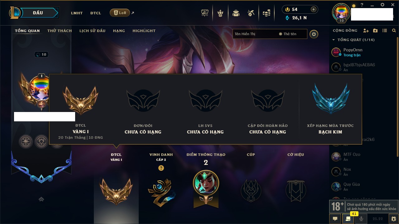 Rank Đơn: Chưa rank mùa nàoKhung: Chưa có khungTướng: 161 - Còn 26101 THXTrang Phục: 34Rank ĐTCL: Vàng ILinh Thú: 1331