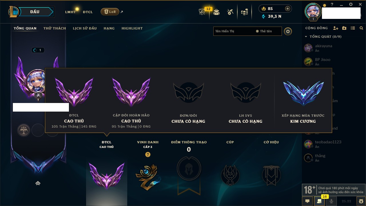 Rank Đơn: Bạc III Khung: Bạc Tướng: 170 - Còn 30078 THX Trang Phục: 225 Rank ĐTCL: Chưa Rank Linh Thú: 138
