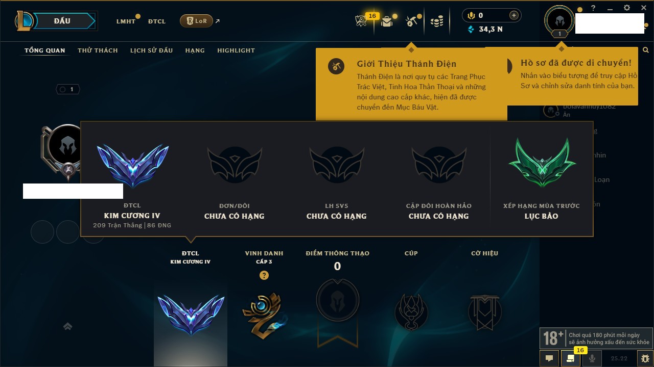 Rank Đơn: Chưa Rank Khung: Chưa có khung Tướng: 157 - Còn 51905 THX Trang Phục: 3 Rank ĐTCL: Chưa Rank Linh Thú: 175