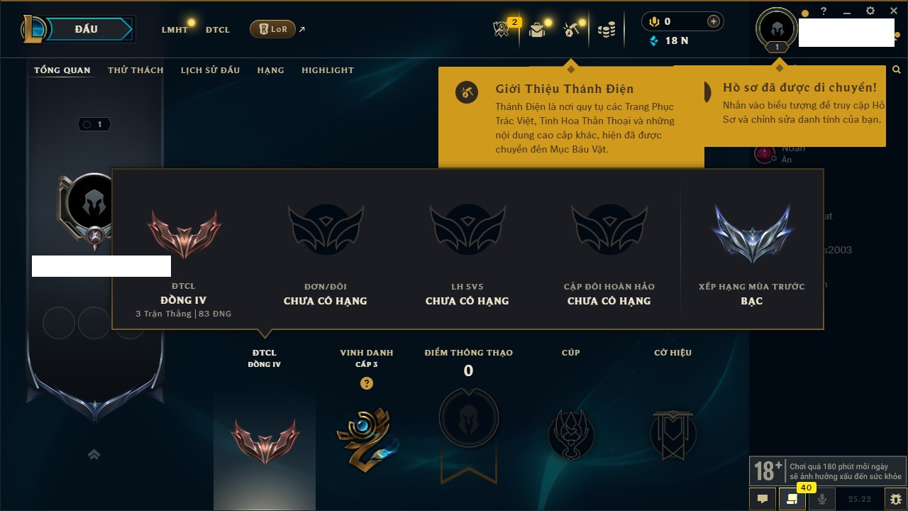 Rank Đơn: Chưa Rank Khung: Chưa có khung Tướng: 157 - Còn 51905 THX Trang Phục: 3 Rank ĐTCL: Chưa Rank Linh Thú: 175