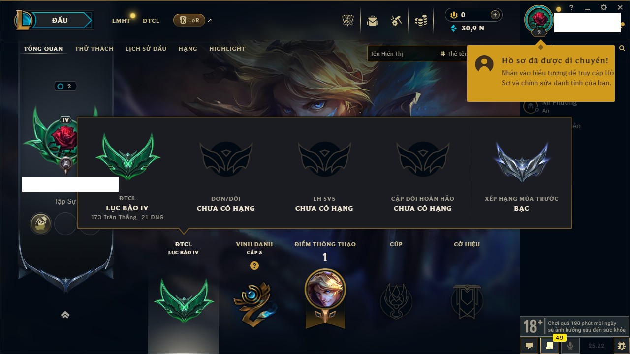 Rank Đơn: Chưa rank mùa nào Khung: Chưa có khung Tướng: 6 - Còn 8795 THX Trang Phục: 0 Rank ĐTCL: Kim Cương IV Linh Thú: 122