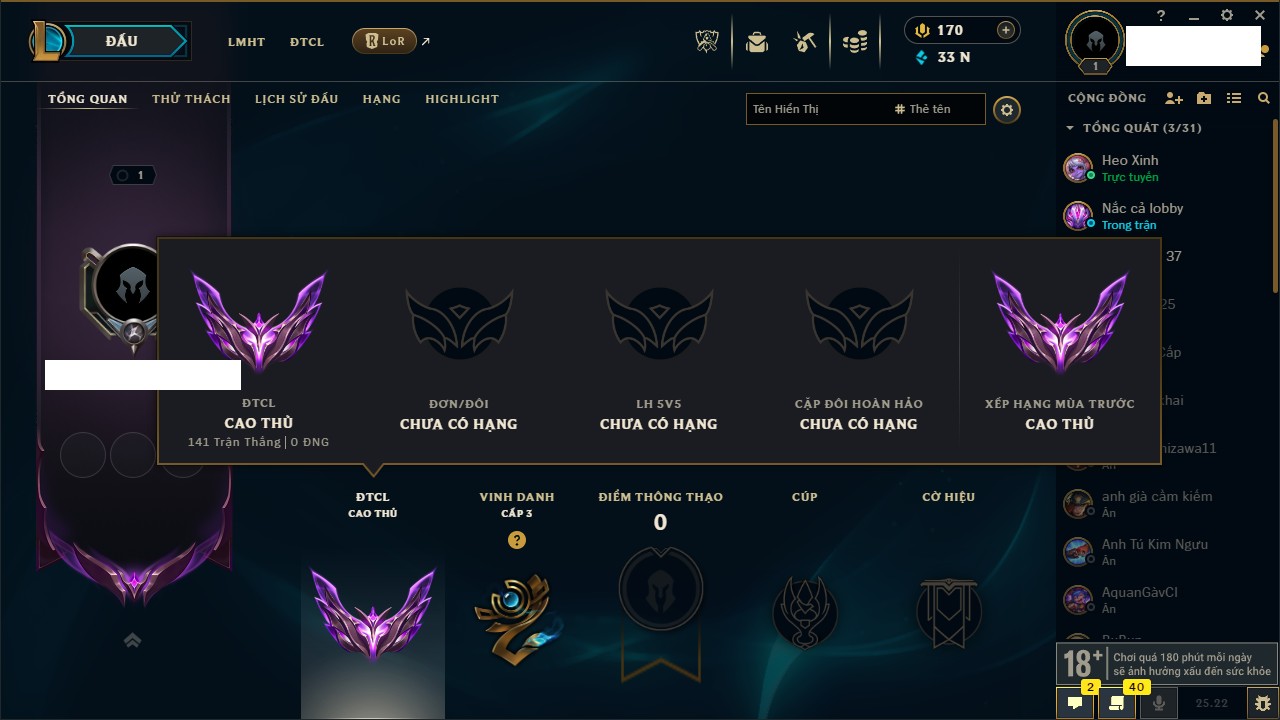 Rank Đơn: Bạch Kim III Khung: Bạch kim Tướng: 171 - Còn 79166 THX Trang Phục: 441 Rank ĐTCL: Bạc IV Linh Thú: 354