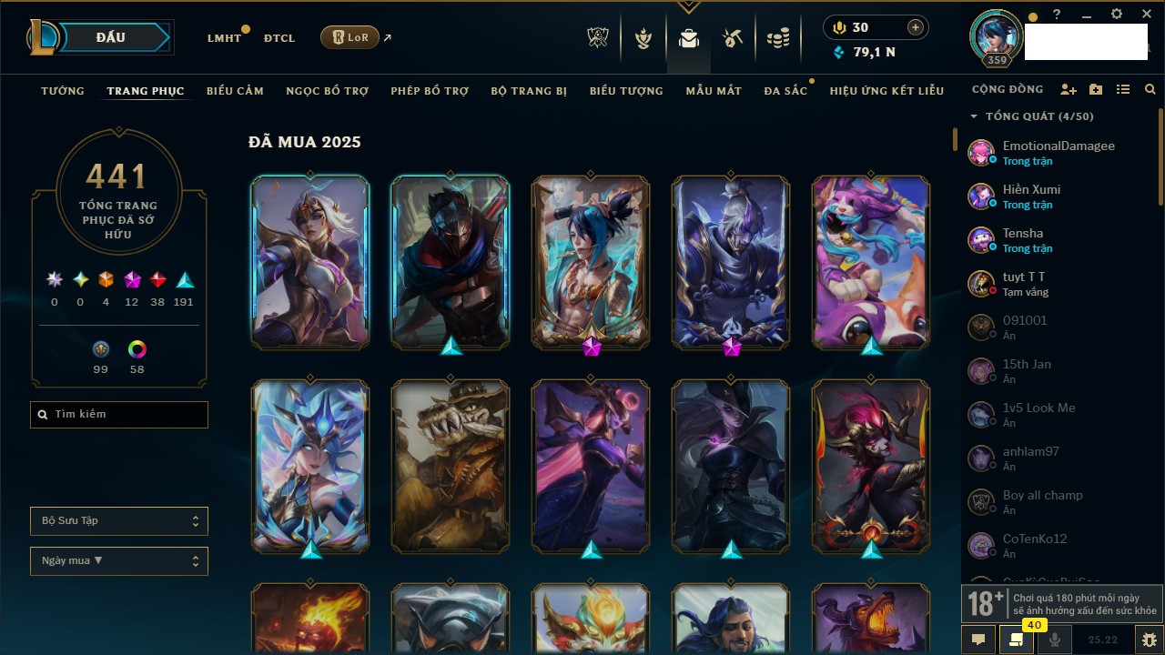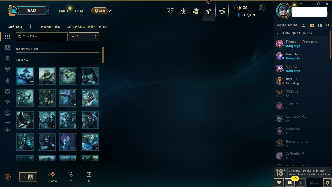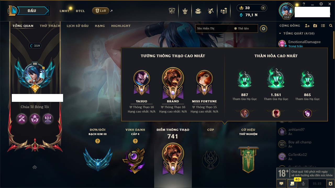 Rank Đơn: Bạch Kim III Khung: Bạch kim Tướng: 171 - Còn 79166 THX Trang Phục: 441 Rank ĐTCL: Bạc IV Linh Thú: 354