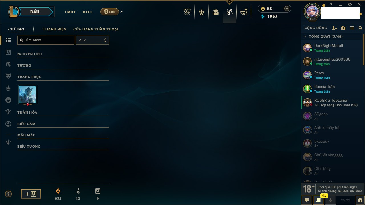 Rank Đơn: Chưa RankKhung: Chưa có khungTướng: 37 - Còn 27387 THXTrang Phục: 10Rank ĐTCL: Chưa RankLinh Thú: 1