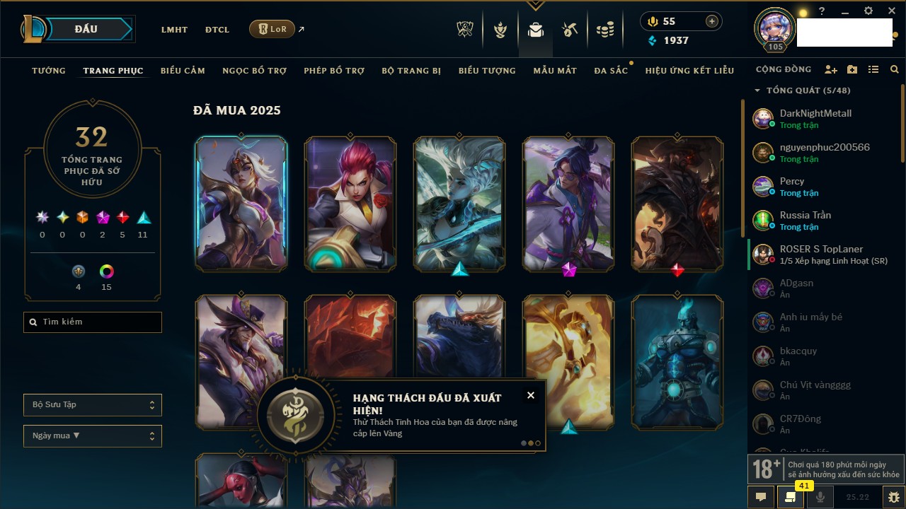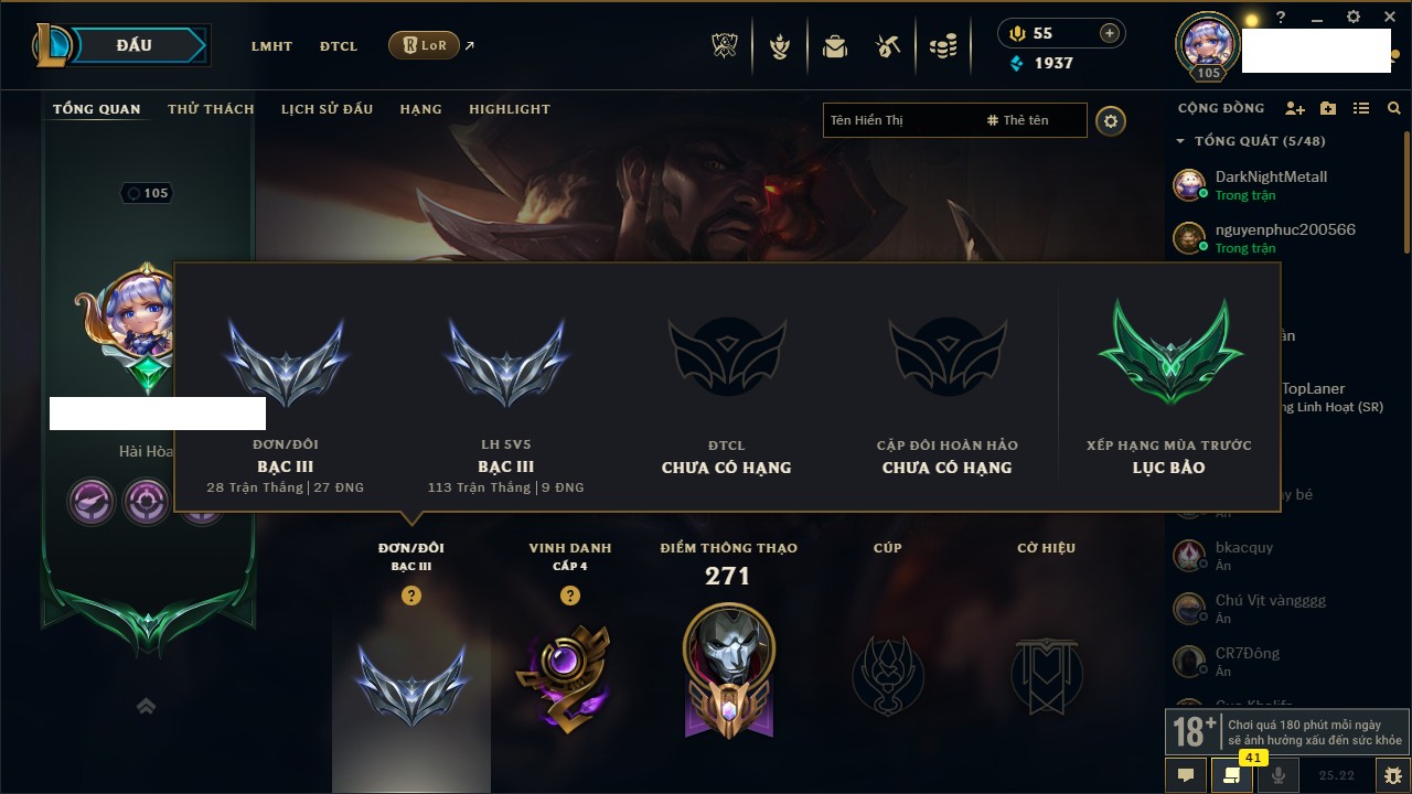 Rank Đơn: Chưa RankKhung: Chưa có khungTướng: 165 - Còn 3214 THXTrang Phục: 160Rank ĐTCL: Chưa RankLinh Thú: 28