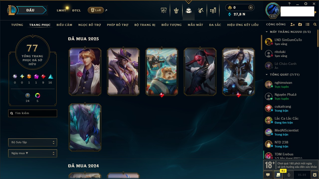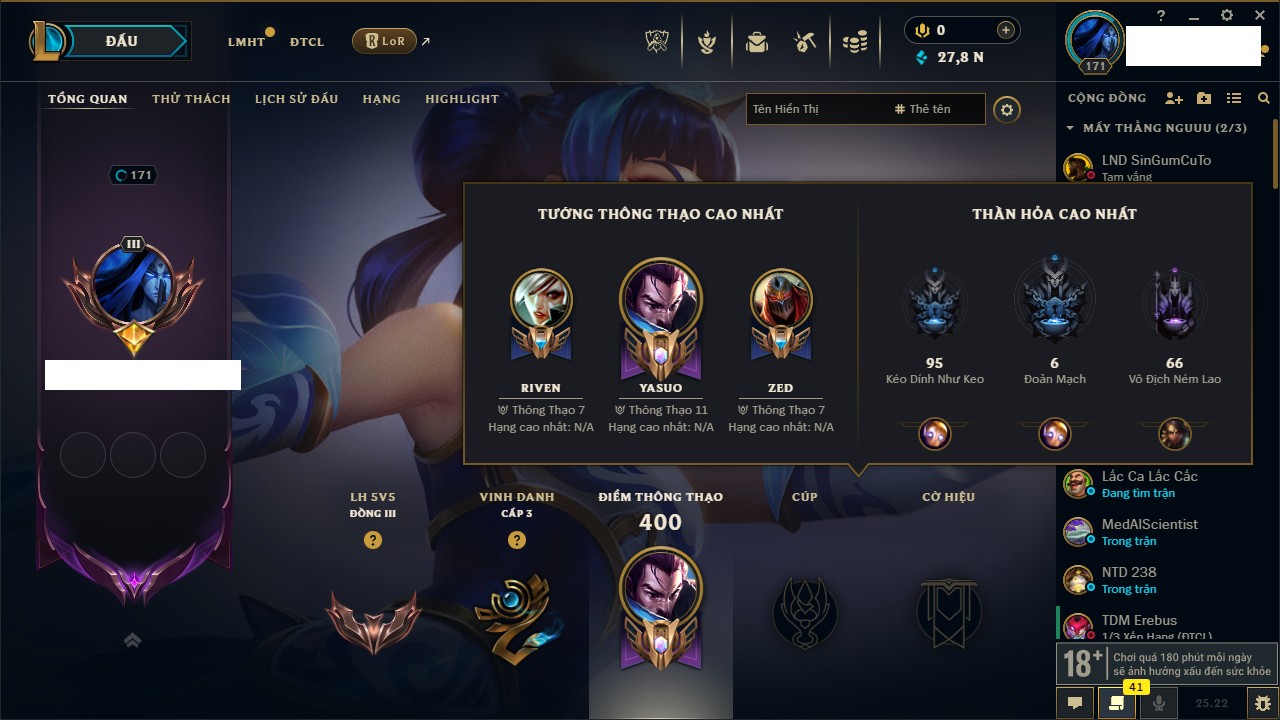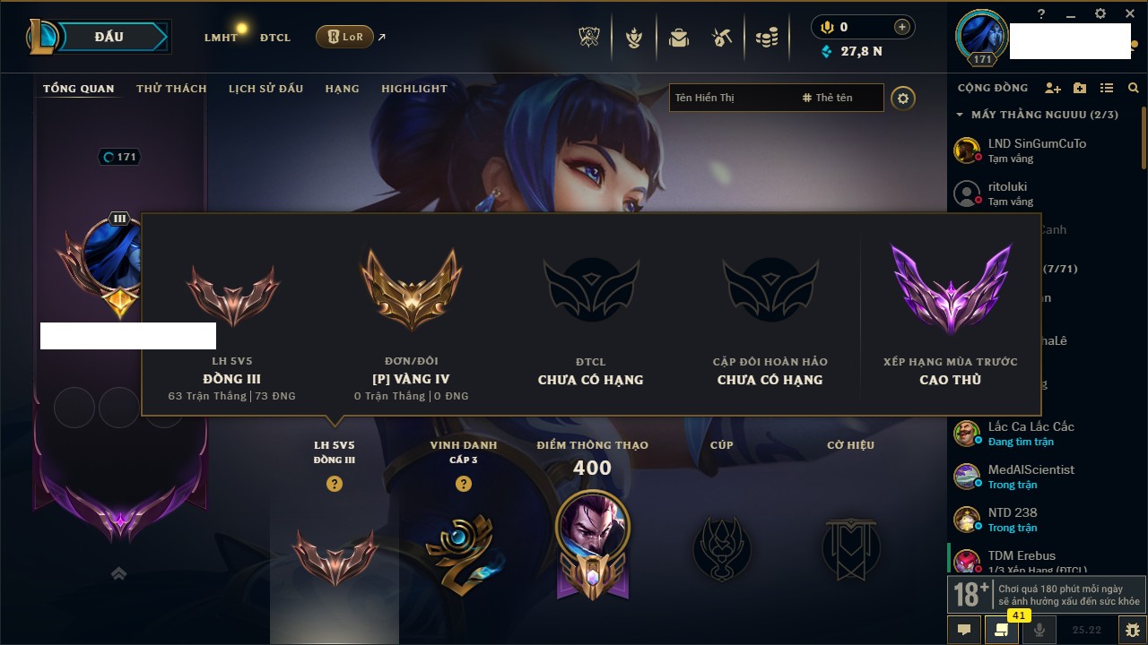 Rank Đơn: Vàng IVKhung: BạcTướng: 171 - Còn 116977 THXTrang Phục: 142Rank ĐTCL: Đồng IILinh Thú: 97