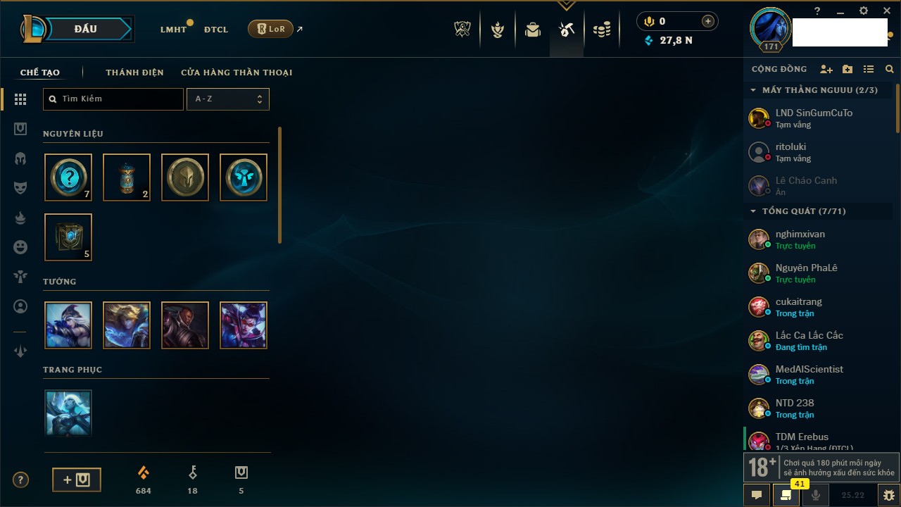 Rank Đơn: Chưa RankKhung: Chưa có khungTướng: 162 - Còn 12067 THXTrang Phục: 175Rank ĐTCL: Chưa RankLinh Thú: 22