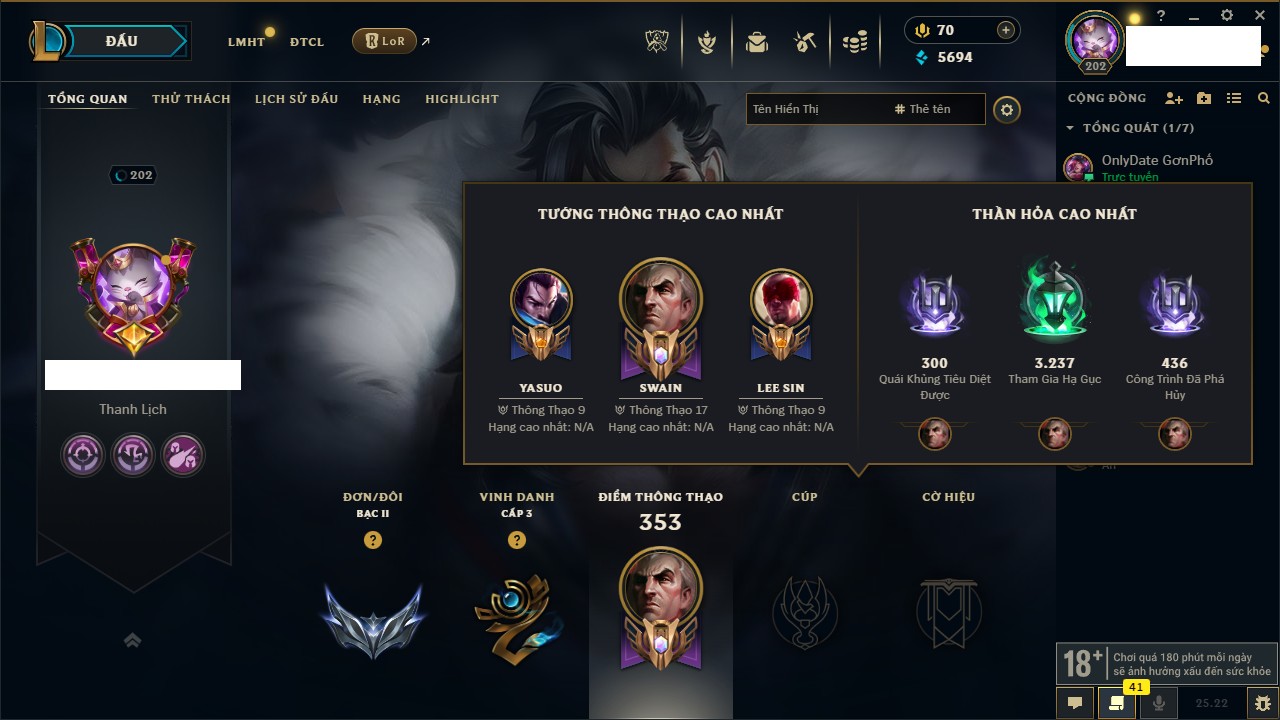 Rank Đơn: Vàng IVKhung: BạcTướng: 166 - Còn 180925 THXTrang Phục: 163Rank ĐTCL: Chưa RankLinh Thú: 67