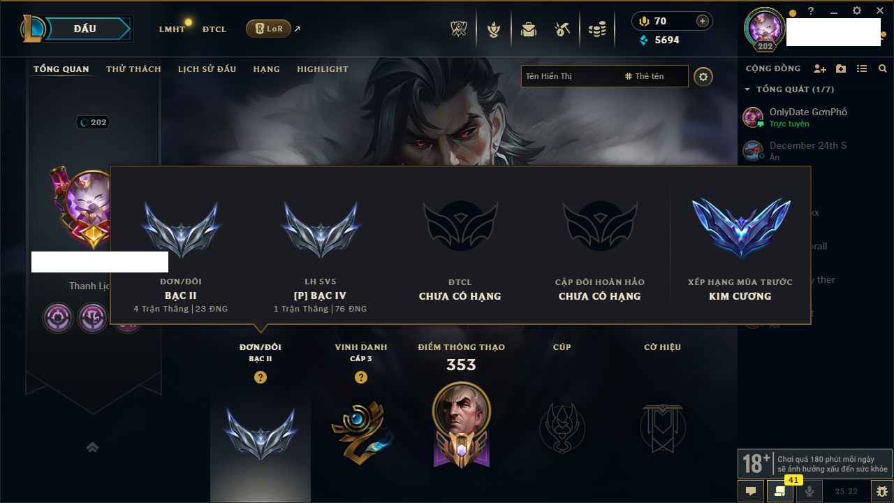 Rank Đơn: Bạc IIKhung: VàngTướng: 171 - Còn 332462 THXTrang Phục: 165Rank ĐTCL: Kim Cương IVLinh Thú: 181