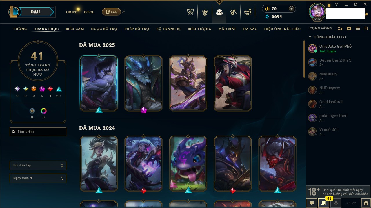 Rank Đơn: Vàng IVKhung: VàngTướng: 171 - Còn 48721 THXTrang Phục: 171Rank ĐTCL: Chưa RankLinh Thú: 27