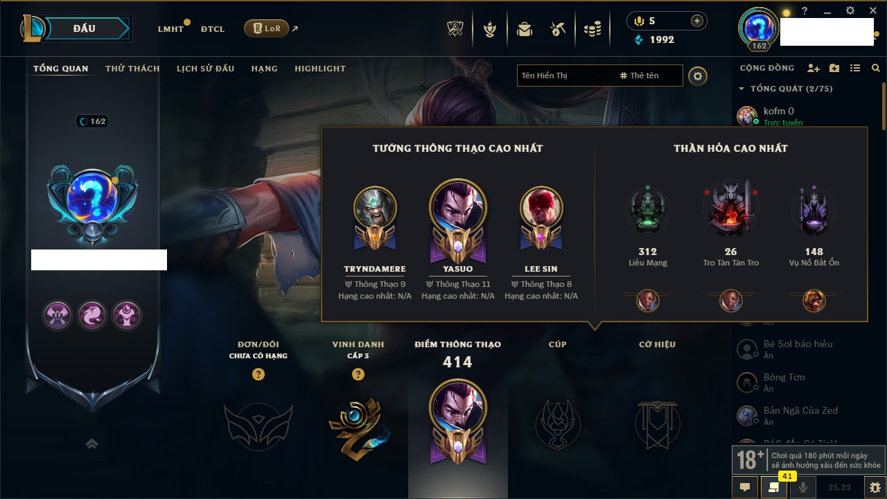 Rank Đơn: Chưa RankKhung: Chưa có khungTướng: 166 - Còn 17966 THXTrang Phục: 188Rank ĐTCL: Chưa RankLinh Thú: 25